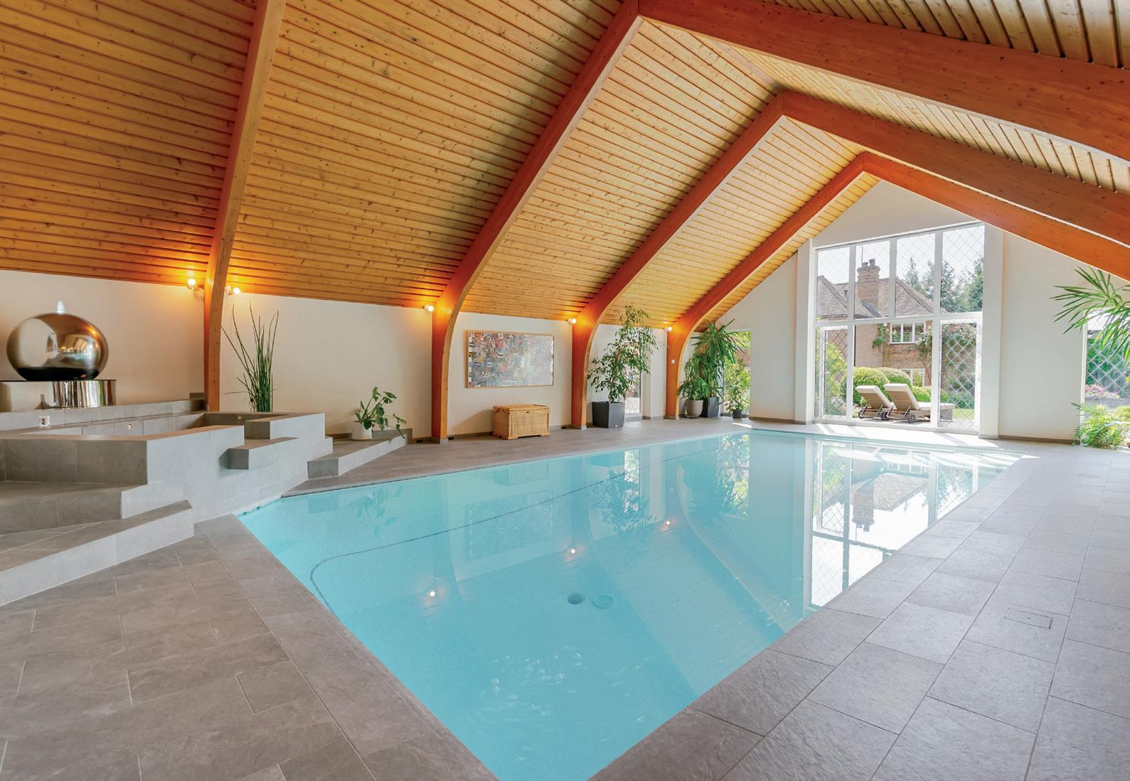Enhancing the lifestyle appeal is a covered outdoor dining area with open side and equipped with Sonos speakers (available by separate negotiation) and a heater, allowing for year-round enjoyment. A patio area adjacent to the dining space and directly outside the double doors to the indoor pool provides an excellent setting for garden furniture and al fresco entertaining. A hot tub (also available by separate negotiation) is located here, taking full advantage of the garden’s serenity.
