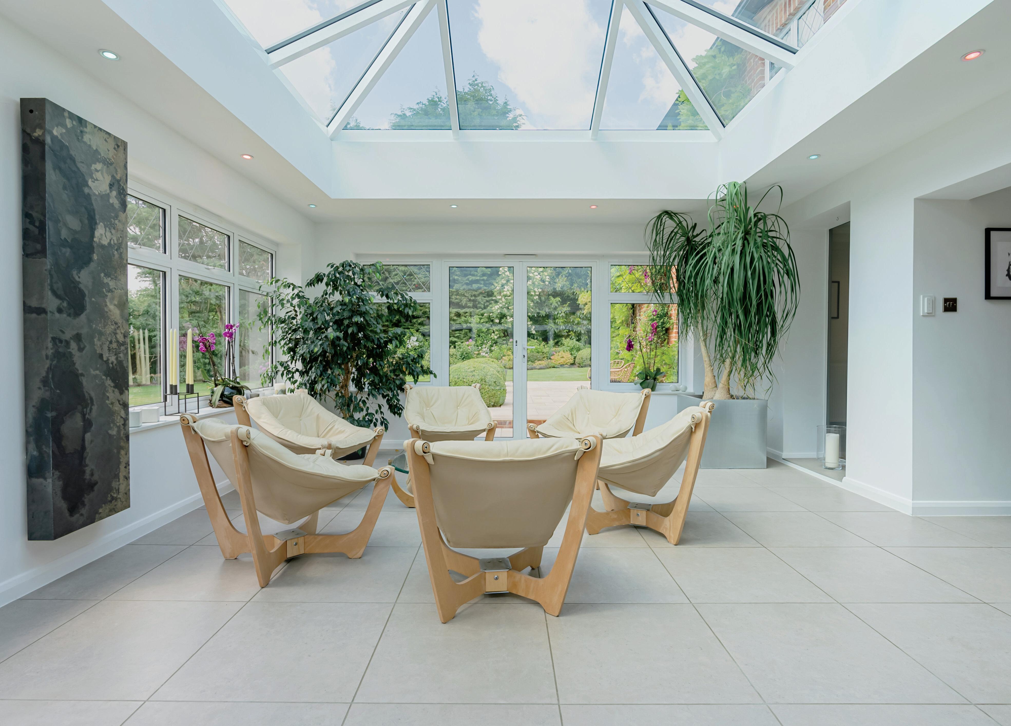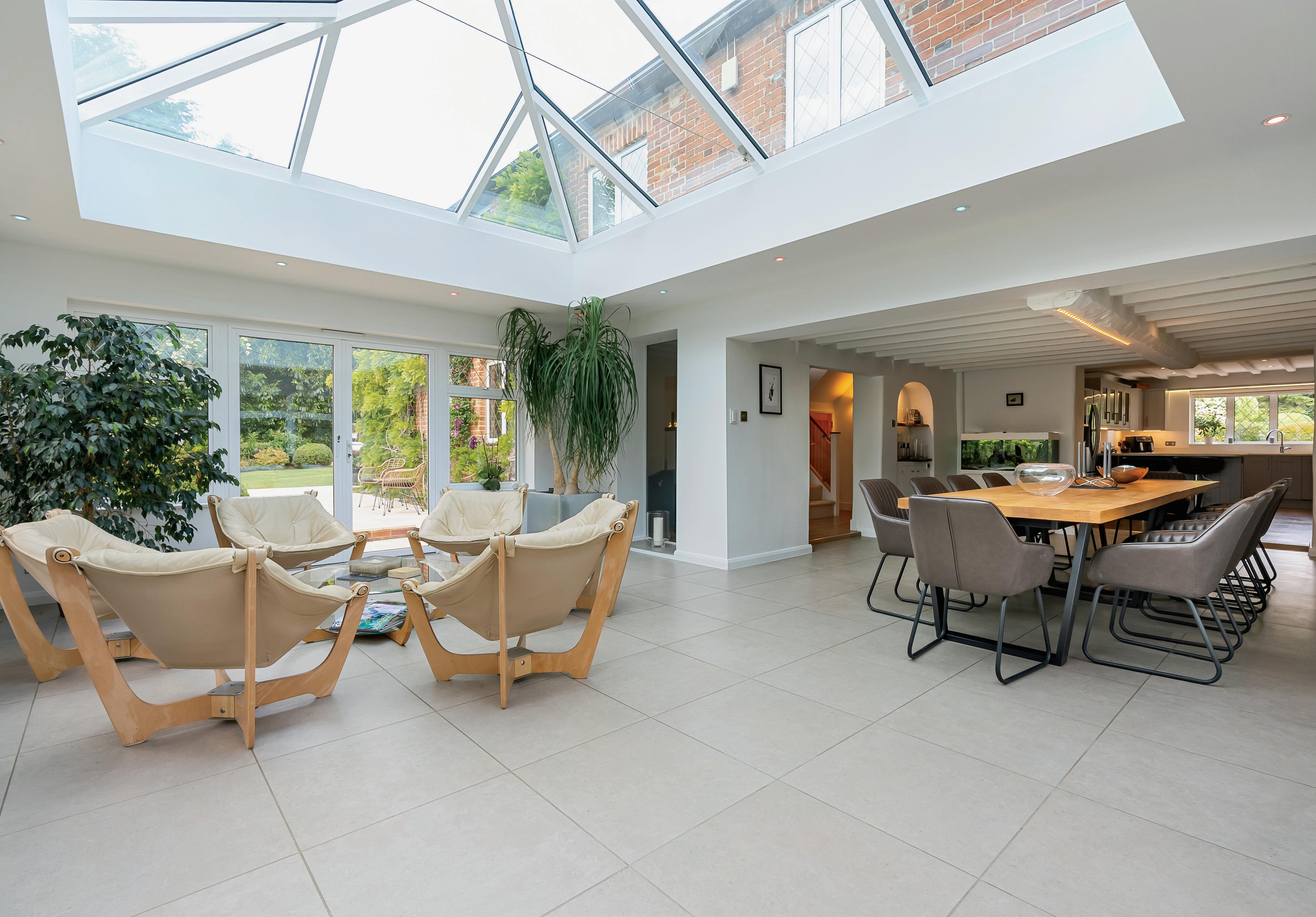 These rooms can be accessed from the entrance hall through glazed doors or via an opening from the rear lobby. Placing ourselves back into the entrance hall we enter the kitchen/breakfast room which has been totally refitted with modern base and wall cabinetry, again in calm tones, with light quartz work surface, one and a half bowl grey stone sink with mixer taps and a breakfast bar. There is a window overlooking the front lawns. The kitchen is well appointed with Neff integrated appliances including a coffee machine, microwave oven, two ovens, and integrated twin dishwashers. Within the breakfast bar area is a wine rack and wine cooler. There is space for an American style fridge freezer and a large bespoke larder corner unit with shelving. The dining area space will comfortably accommodate a 12-seat table, and the floors are porcelain tiled through to the orangery. Beamed ceilings and a feature arched alcove with built in cupboards below. The orangery is a recent extension which greatly enhances the desirable open plan living style and creates a good flow to the ground floor. It has a large lantern pitched glass roof, designer wall mounted radiator, low level walls and windows to all sides allow uninterrupted views of the beautiful gardens, a great location for all seasons. Having the orangery really helps bring a sense of the outdoors inside with double doors leading to the rear terrace and garden.