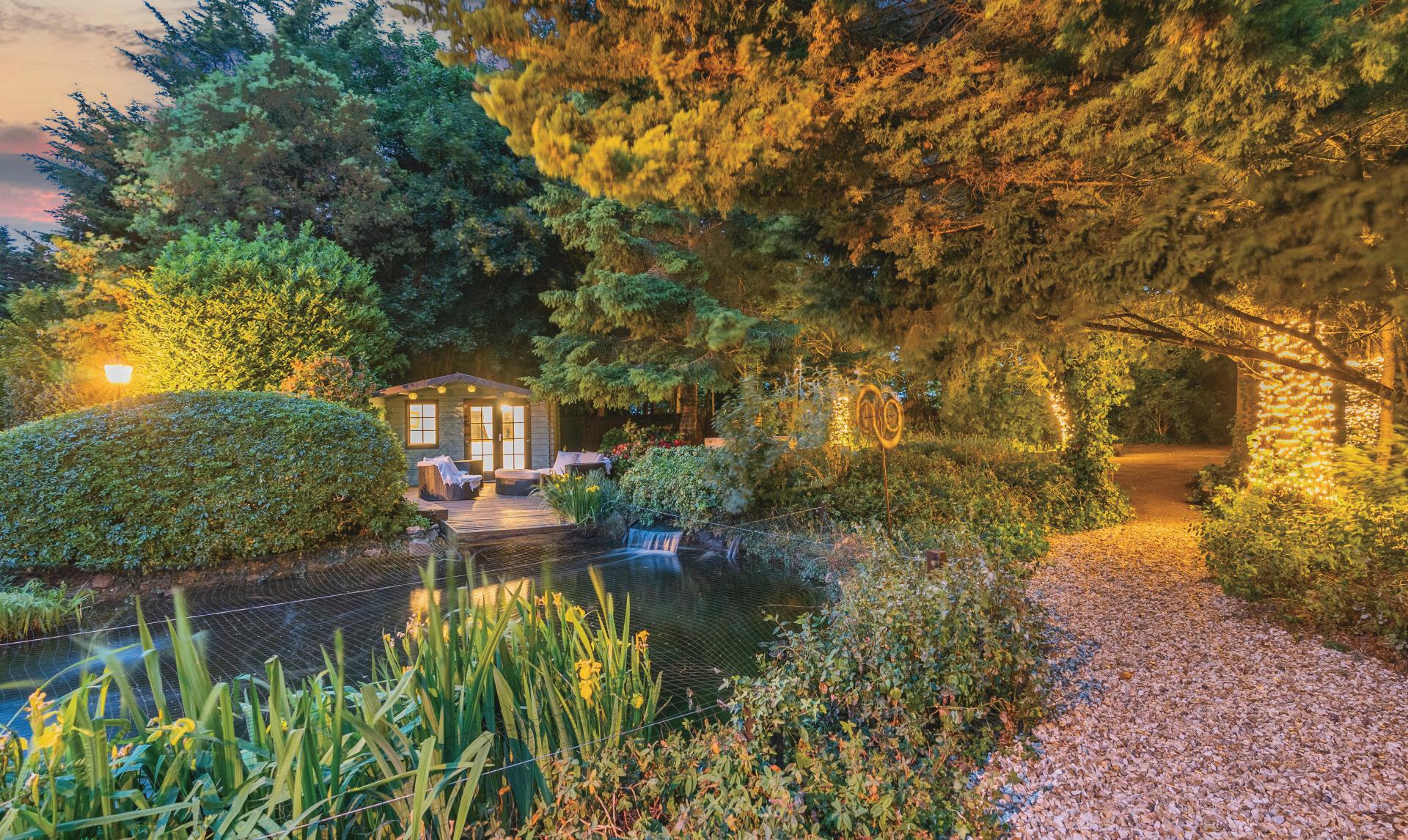 Outside, the property is approached via twin electric gates and a 100m private driveway. The grounds are thoughtfully designed and well-established, with lawned gardens, mature planting, a koi pond, soft fruit cage, raised vegetable beds and multiple outdoor seating and dining areas.