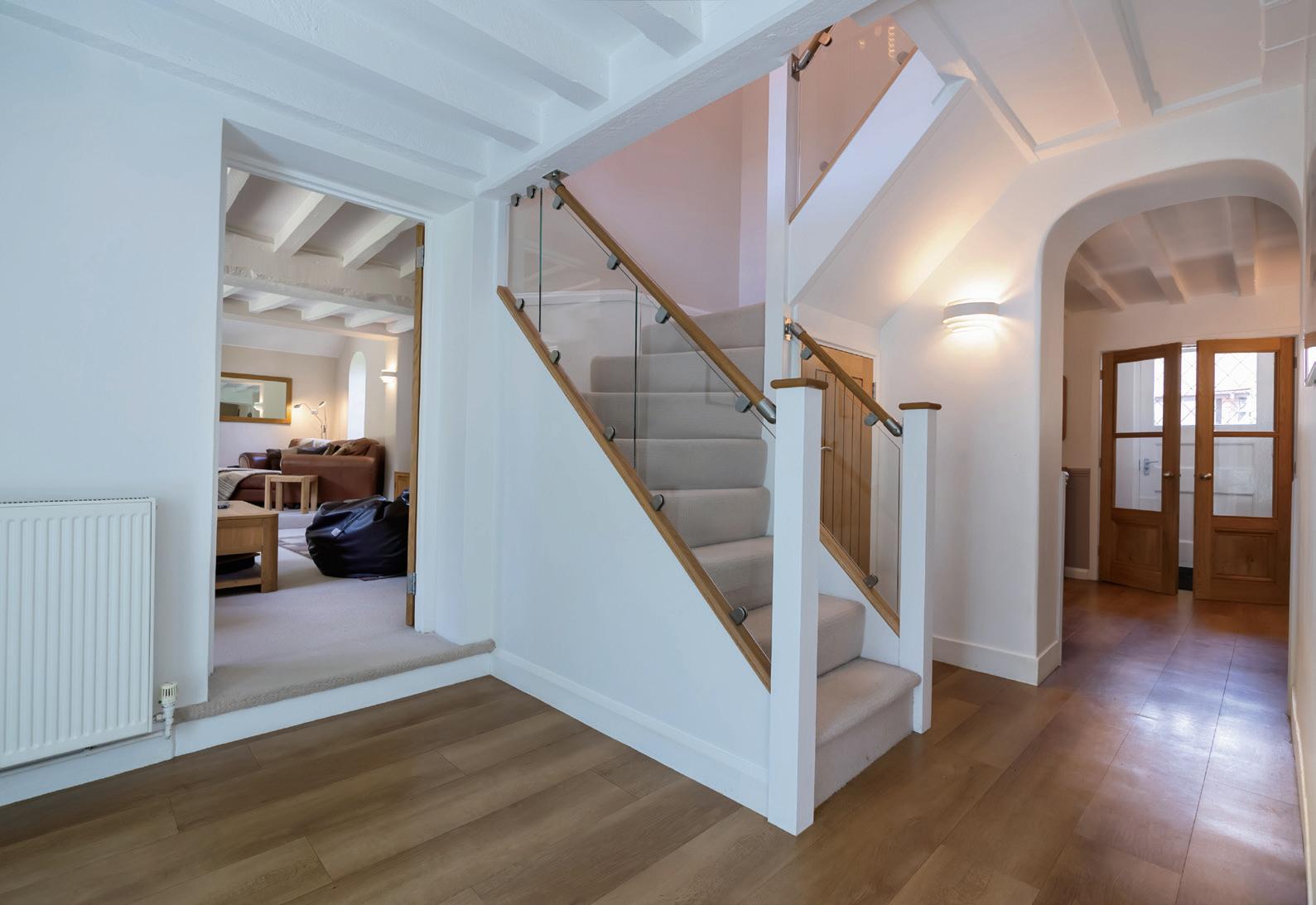 The main residence delivers a beautifully balanced mix of character and contemporary comfort, featuring a welcoming entrance hall, cloakroom, and a spacious dual-aspect lounge with defined zones for relaxing and entertaining. A feature fireplace, timber beams and diamond-leaded glazing enhance the warmth and natural light throughout. The heart of the home lies in the open-plan kitchen, breakfast room, and orangery, creating a superb everyday living and dining space. The kitchen is fitted with high-spec integrated appliances and a bespoke larder, while the adjacent orangery opens onto the rear garden and terrace, blending indoor and outdoor living. Ground floor accommodation includes a formal dining area, a study and a generous utility/boot room.