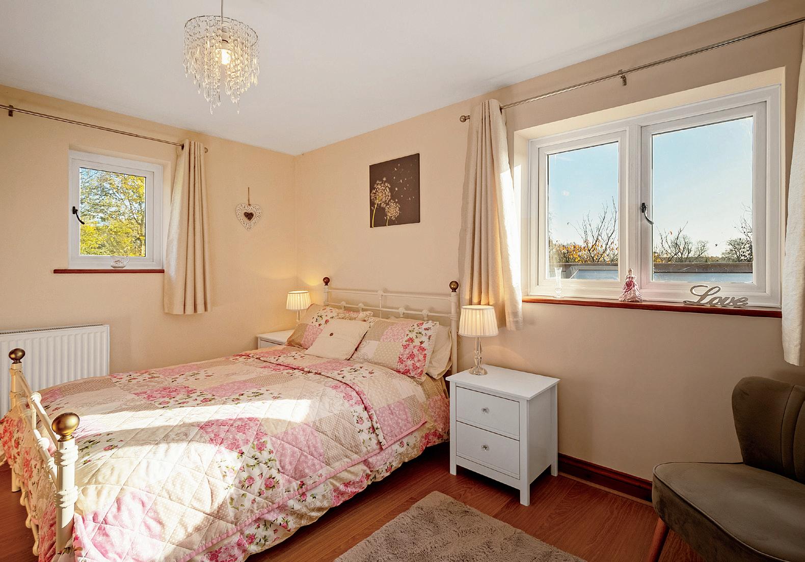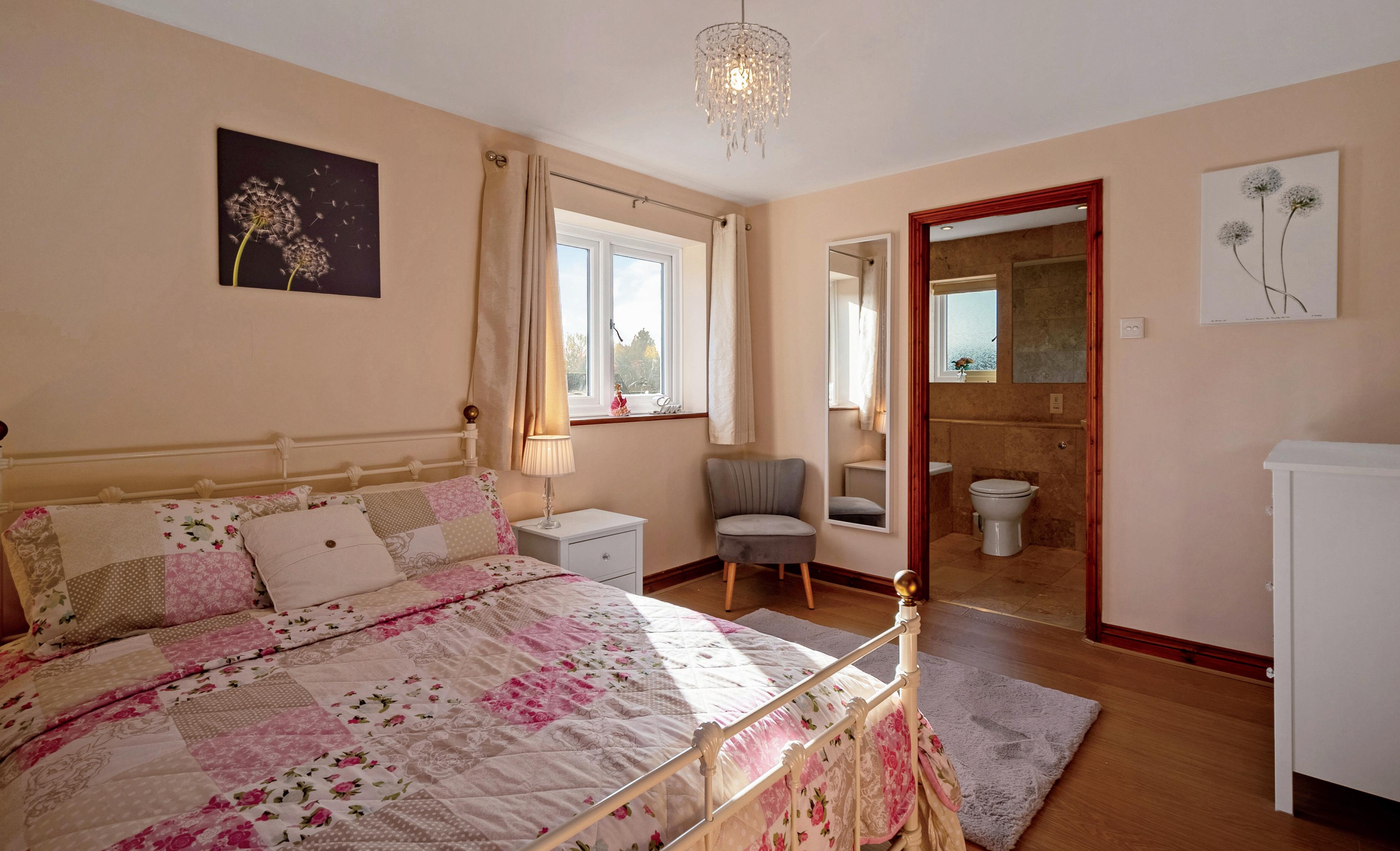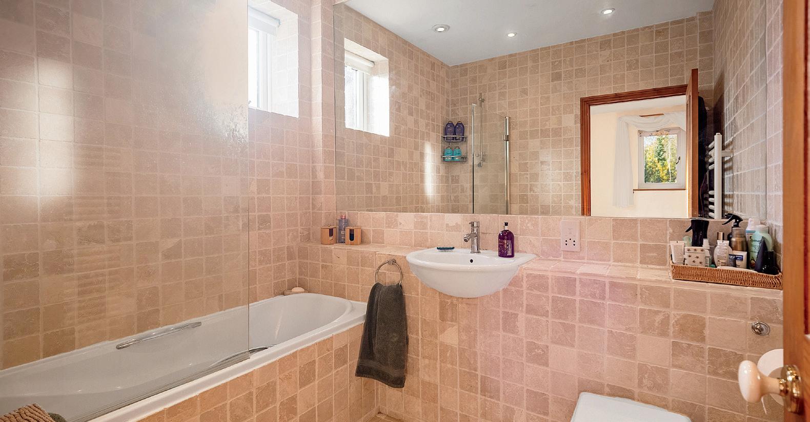 To the first floor, the feature bedroom has a built in wardrobe, windows to two elevations and access to a lovely en-suite with travertine tiles, which benefits from both a bath and a shower.