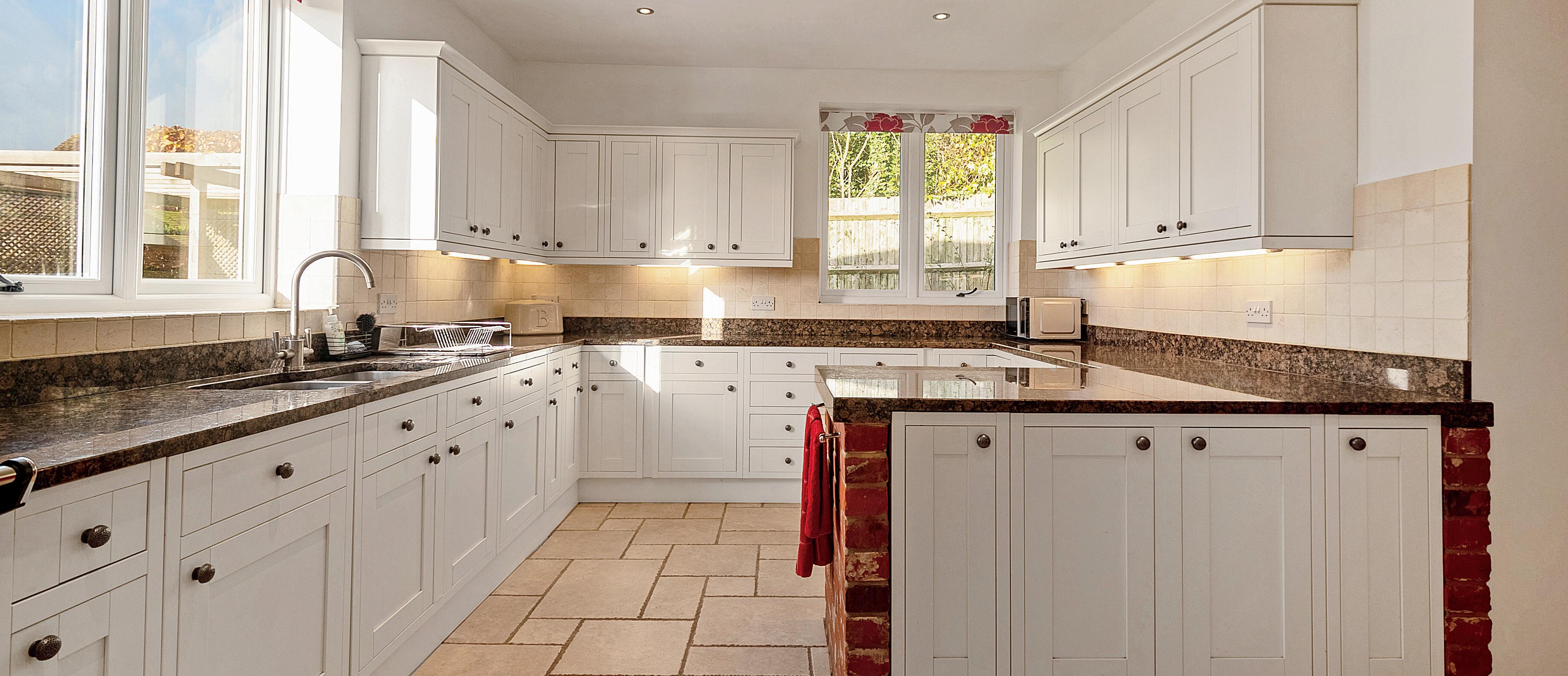 The wonderful open plan kitchen has ample granite work tops and marble tiling, integrated dishwasher, fridge, freezer and Rangemaster oven, multiple base and eye level units, breakfast bar, space for a table to seat ten guests, and access to the utility room.