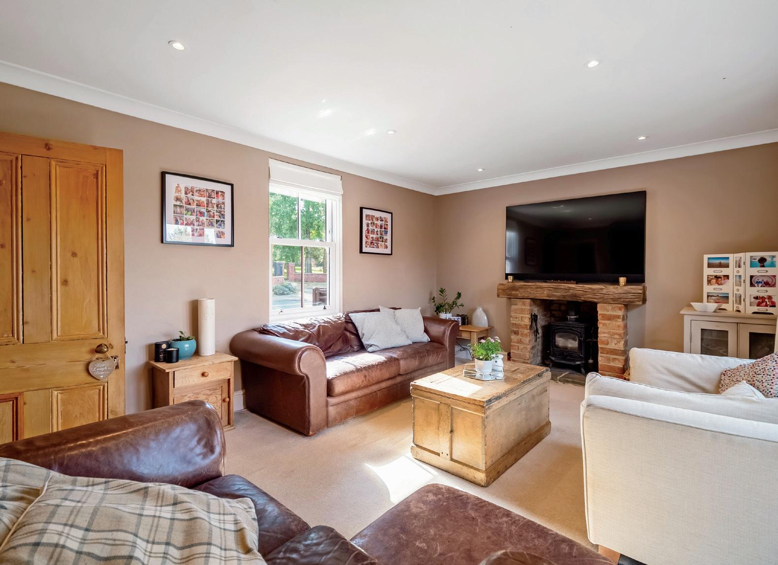 Natural light is one of the property’s greatest luxuries. Thanks to its L-shaped design, the house enjoys sunshine throughout the day, pouring through wide landings, illuminating period timbers, and setting over the far corner of the garden in the evenings. The result is a home that feels bright and uplifting year-round. From the main bedroom, far-reaching views across open fields create a serene backdrop, while the cosy lounge with its log-burning stove becomes the focal point for the family during colder months.
