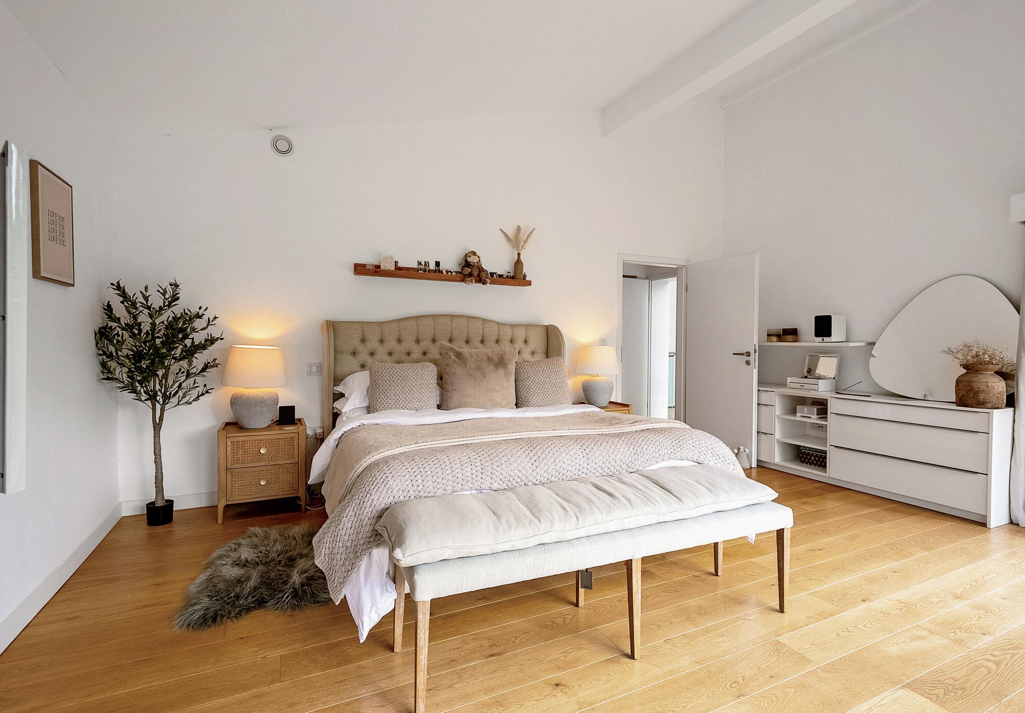 The contemporary wooden staircase with recessed chrome lighting leads up to a bright and airy galleried landing looking out onto the garden and the entertaining area below. To the right of the stairs is the impressive principal bedroom suite which boasts a very large double bedroom with high ceilings, air conditioning and floor to ceiling glazed units with automated blinds leading out onto a West facing private balcony. Leading off the bedroom is the extensive dressing room which flows into the well-appointed ensuite, with walk-in rain shower, his and hers sinks with vanity units and a modern freestanding bath located in the middle of the room.