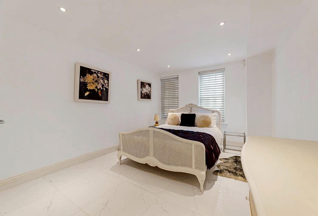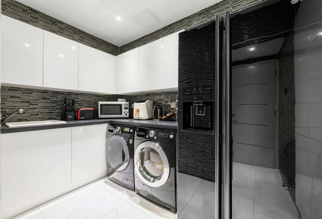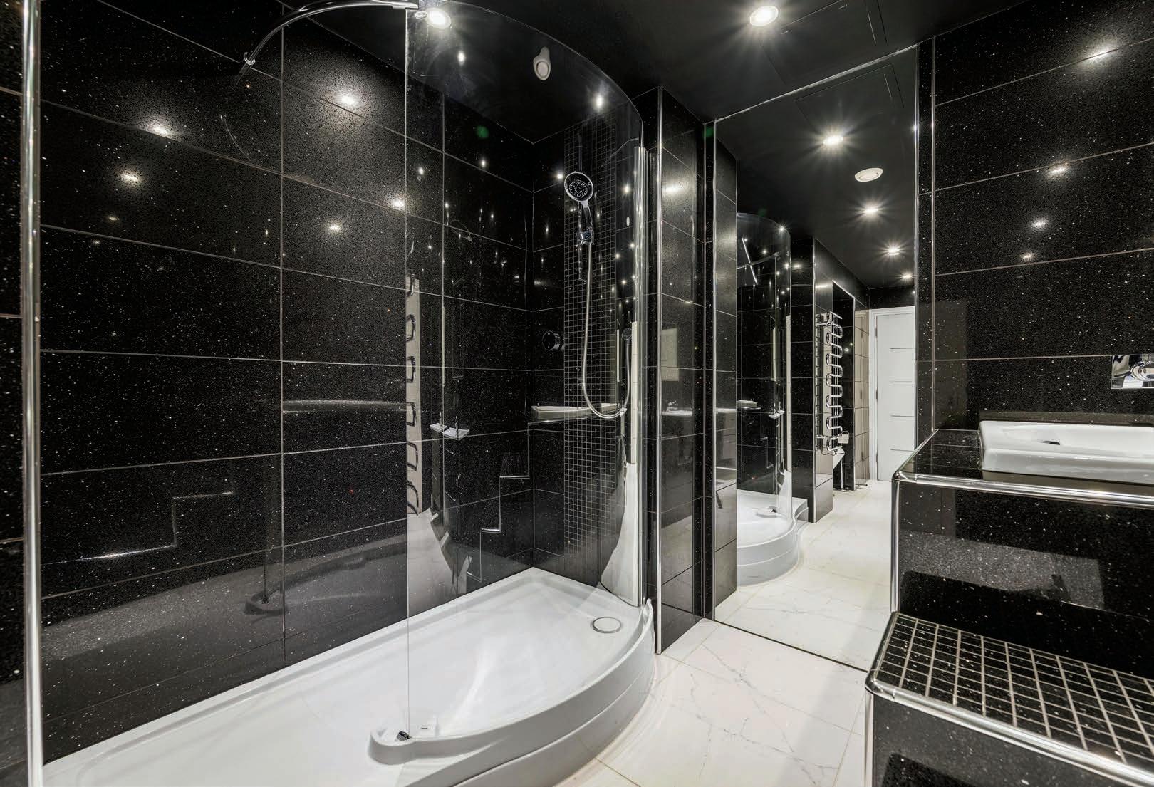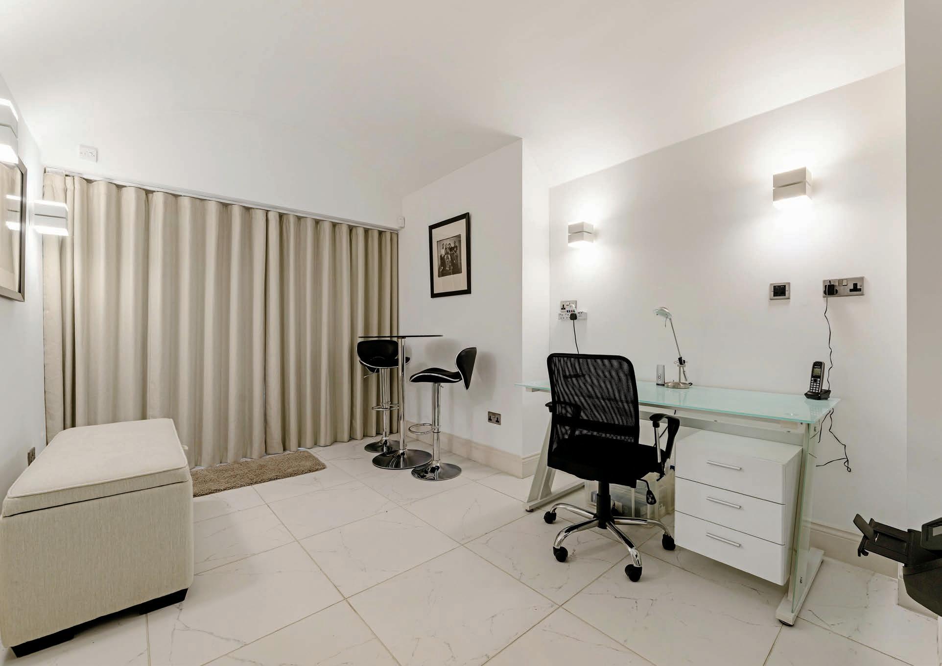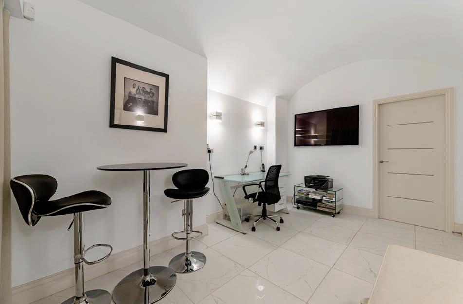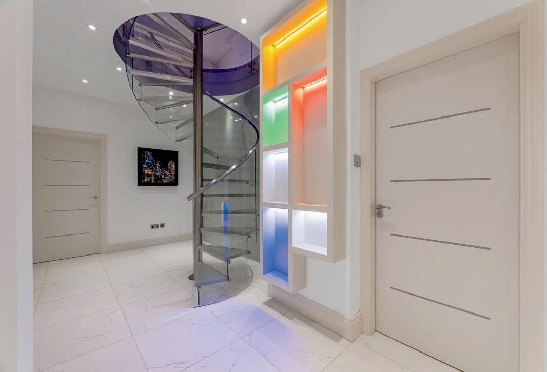 The spiral staircase leads into a spacious hallway on the lower ground floor which in turn leads to three generous double bedrooms, three bathrooms, a utility room and home office. The primary bedroom benefits from a large ensuite with his and hers sinks, walk in shower and Japanese style deep soak bath. The second bedroom has its own ensuite bathroom with walk in shower and the third bedroom has a jack and jill bathroom with shower which can also be accessed from the hallway. The spacious home office has patio doors to the front of the property and access to the convenient utility room.