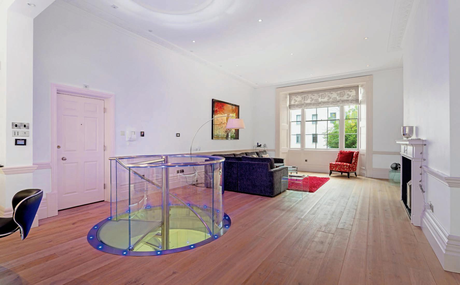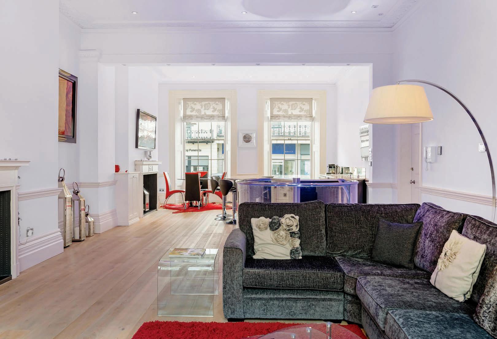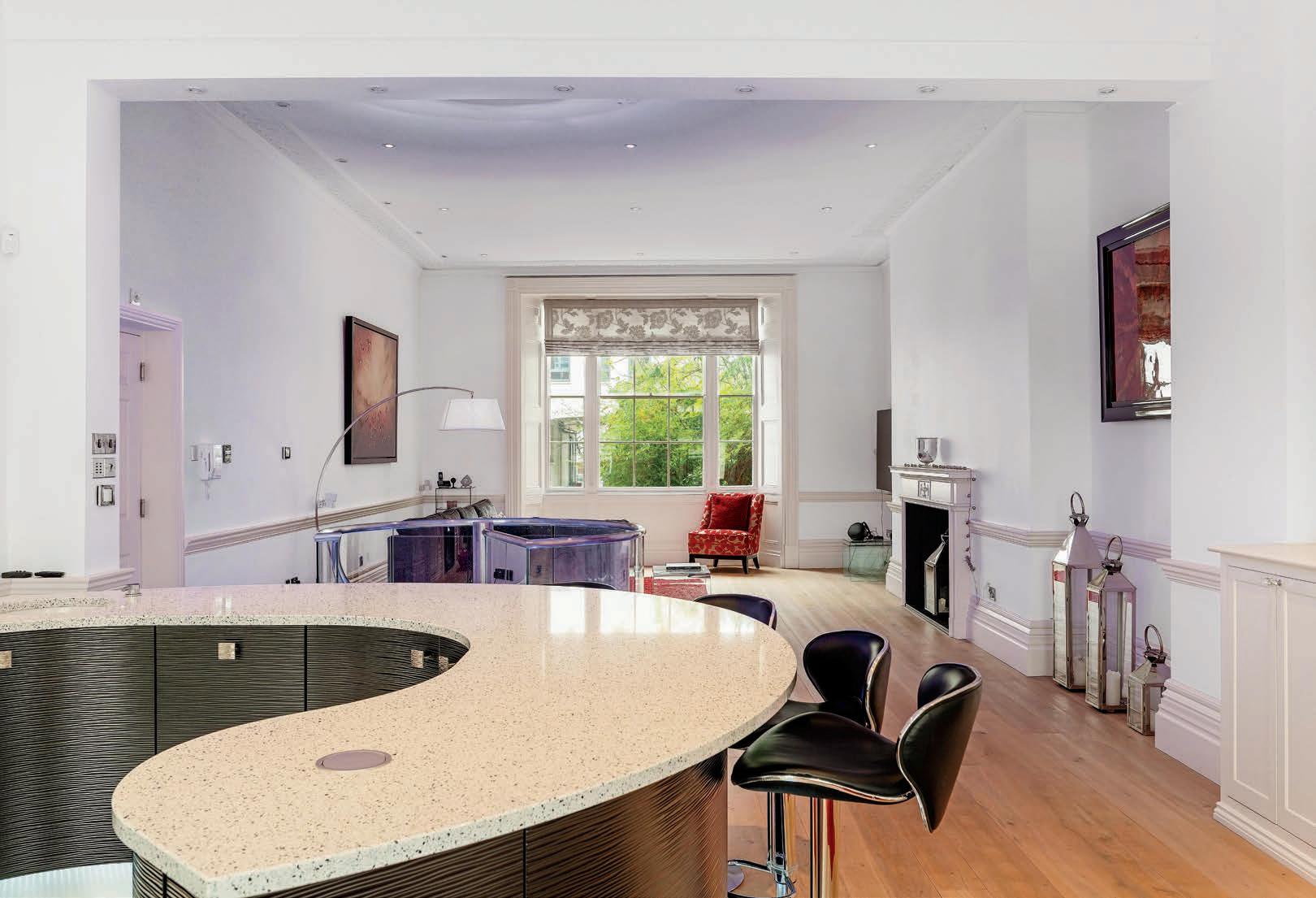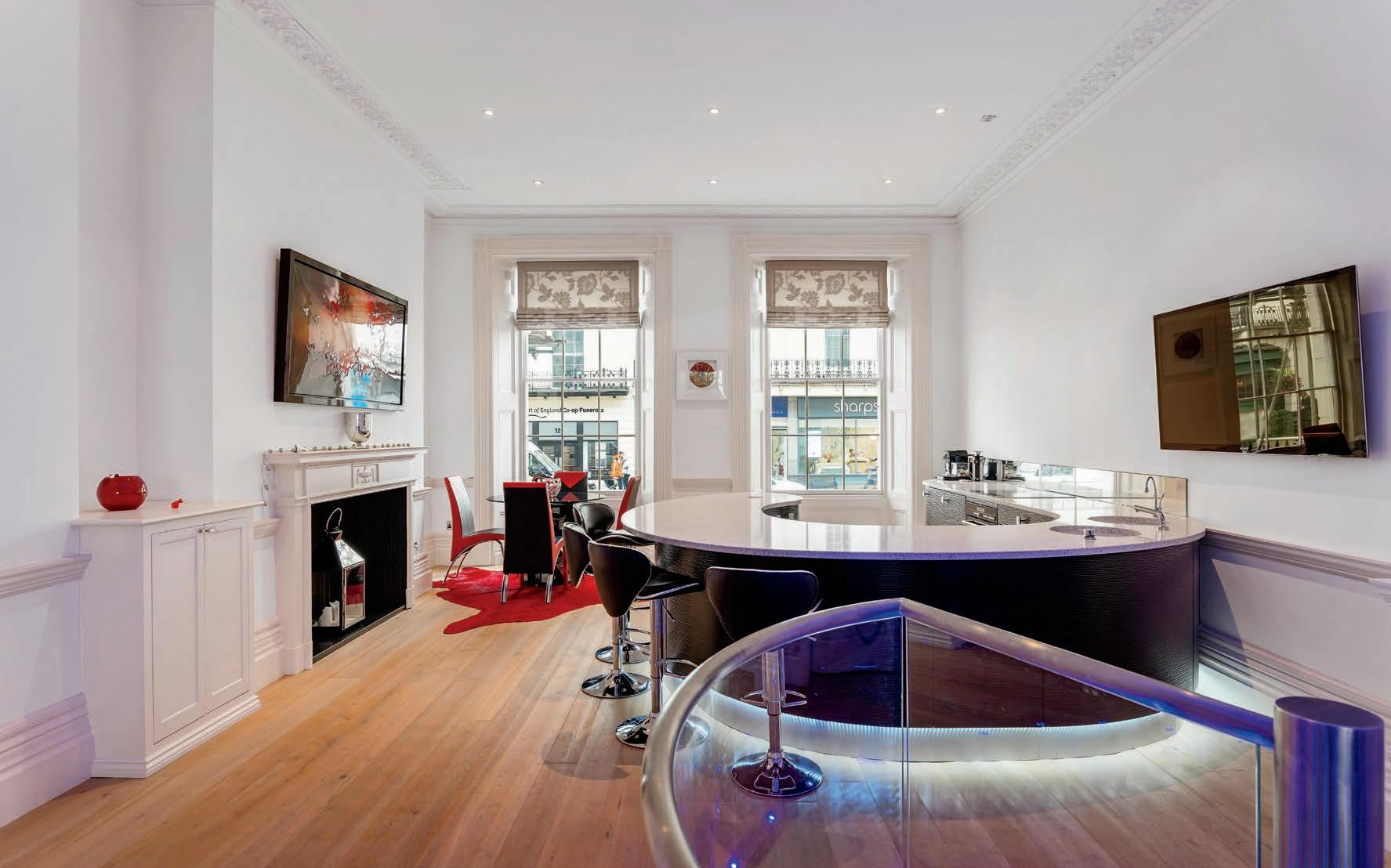 The stunning open plan kitchen and family room on the ground floor combines modern style with character features perfectly. The large sash windows to both the front and rear of the building, flood the space with light. The ornate cornicing and dado rail are in character with the building and blend seamlessly with the modern kitchen and glass spiral staircase to the lower floor. The large curved peninsular island with downlights and bar seating is perfect for entertaining and the feature fireplace defines the dining area perfectly. To the rear of the room is the spacious family living area, again with feature fireplace, cornicing and dado rail. The glass spiral staircase with uplighters is a real focus point of the room and maximises the space on both levels.