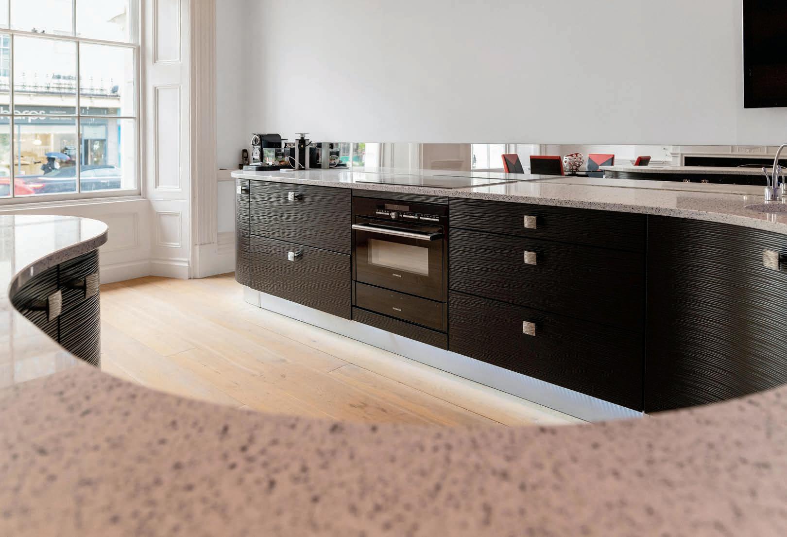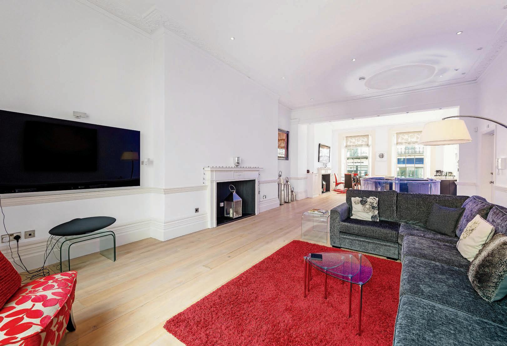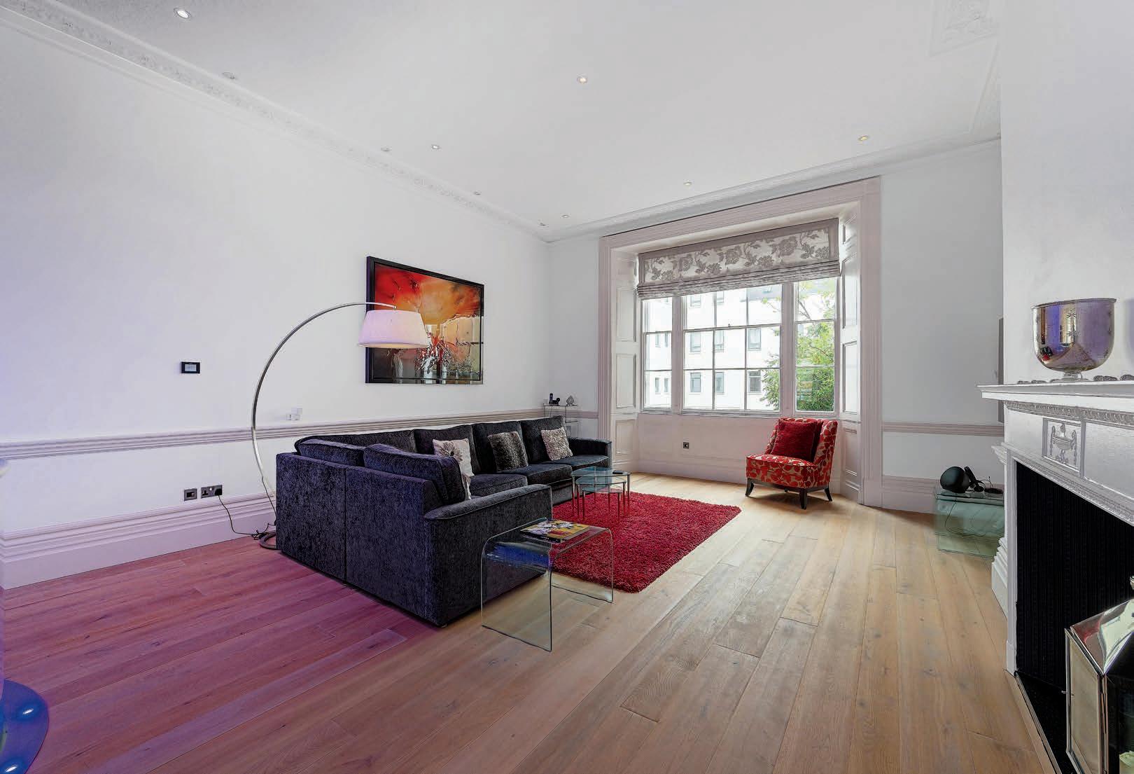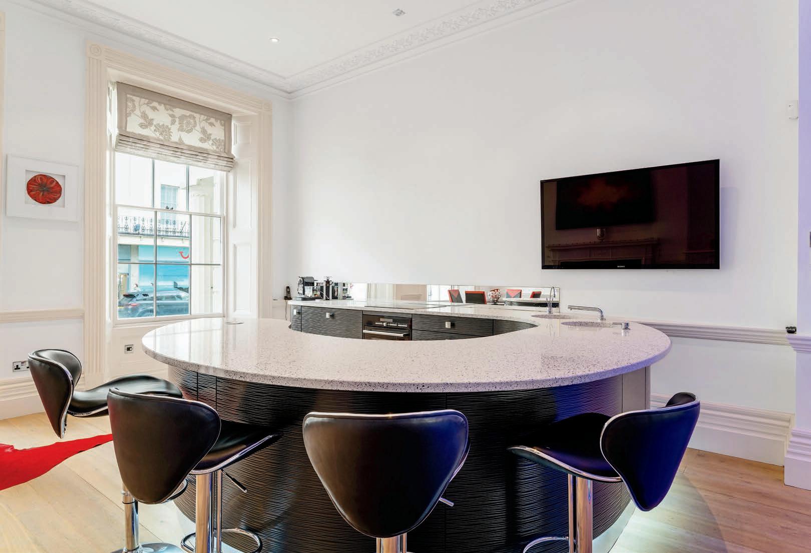 The stunning open plan kitchen and family room on the ground floor combines modern style with character features perfectly. The large sash windows to both the front and rear of the building, flood the space with light. The ornate cornicing and dado rail are in character with the building and blend seamlessly with the modern kitchen and glass spiral staircase to the lower floor. The large curved peninsular island with downlights and bar seating is perfect for entertaining and the feature fireplace defines the dining area perfectly. To the rear of the room is the spacious family living area, again with feature fireplace, cornicing and dado rail. The glass spiral staircase with uplighters is a real focus point of the room and maximises the space on both levels.