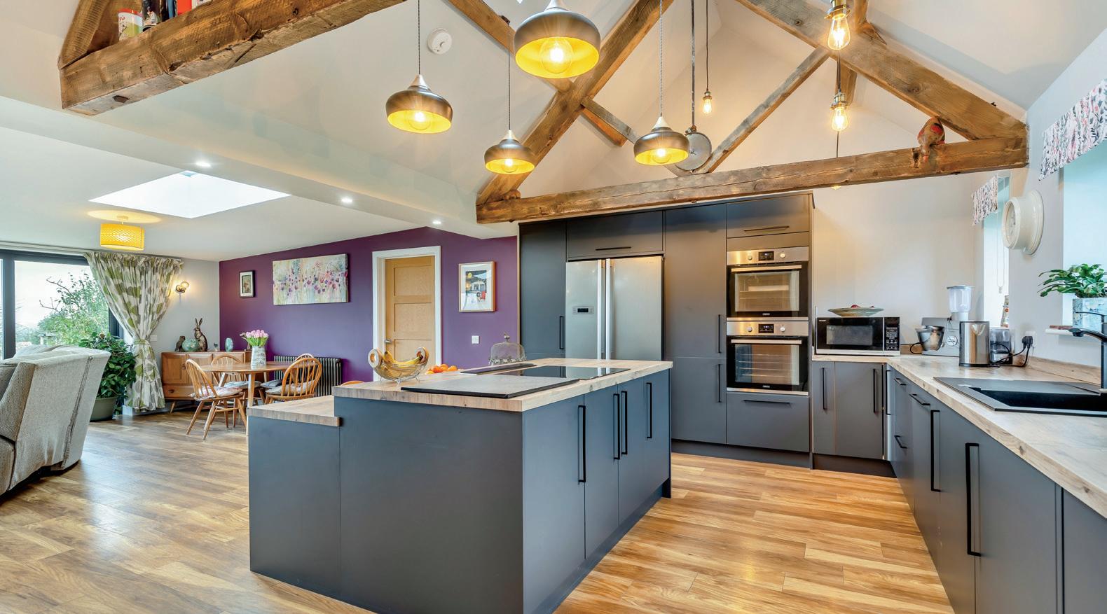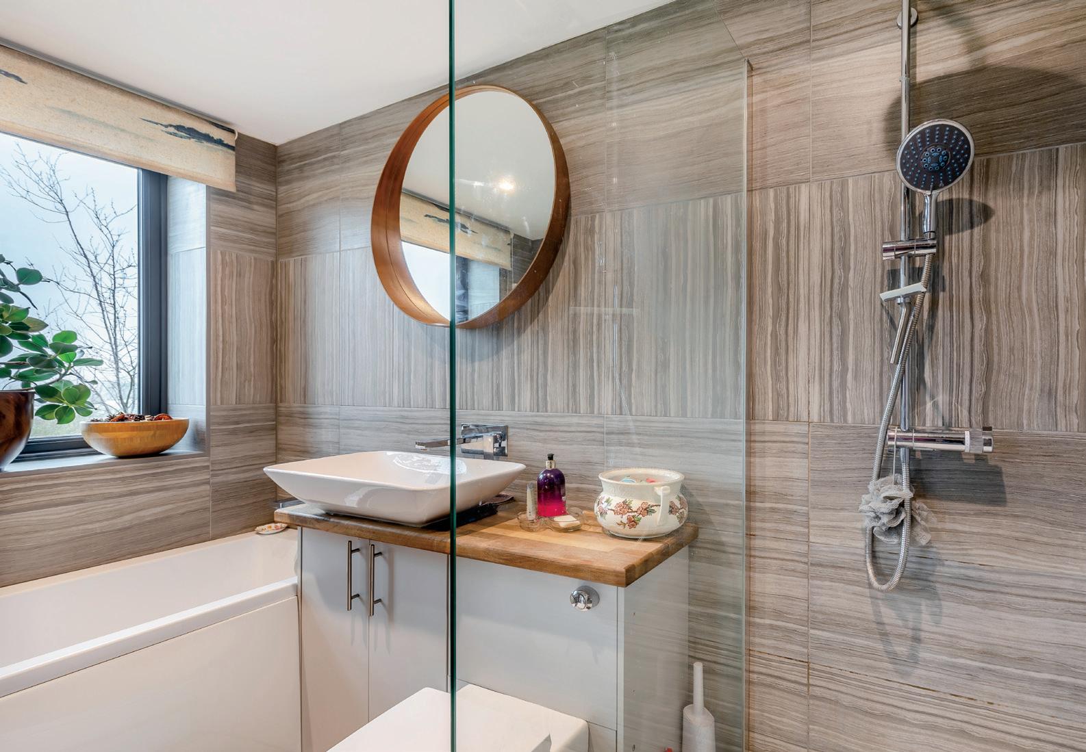 “Outside, the cottage garden at the front of the house adds charm, while the rear garden is lowmaintenance, leaving more time to enjoy the grounds,” the owners continue. “Beyond, you’ll find rows of stunning dahlias and other flowers, perfect for cutting or simply admiring; and a small woodland for children to explore. For horse lovers such as our daughters, the property includes a menage and stables with panoramic views over the land and across the channel. With 5 acres of land, the property offers the ideal amount of space to enjoy all that the Somerset countryside has to offer, without being overwhelming to manage. The property also features spacious outbuildings which could be converted into additional living space or even a revenuegenerating Airbnb to service nearby Bristol Airport.”