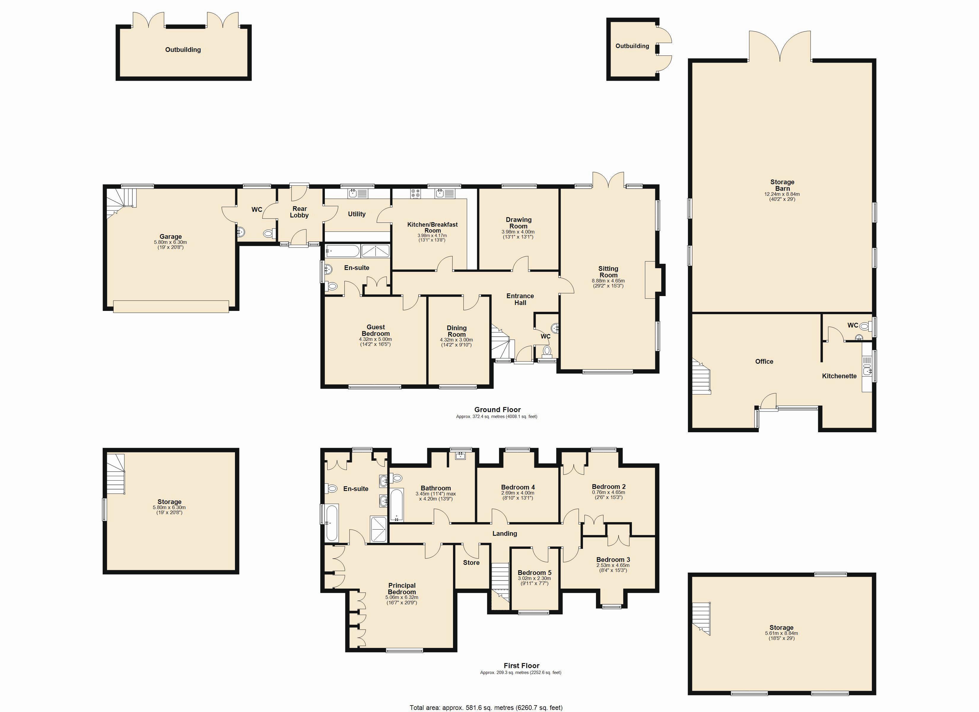 Upstairs, the principal suite enjoys an en-suite bathroom, accompanied by four further bedrooms, a family bathroom, and a study/storeroom, ideal for working from home.