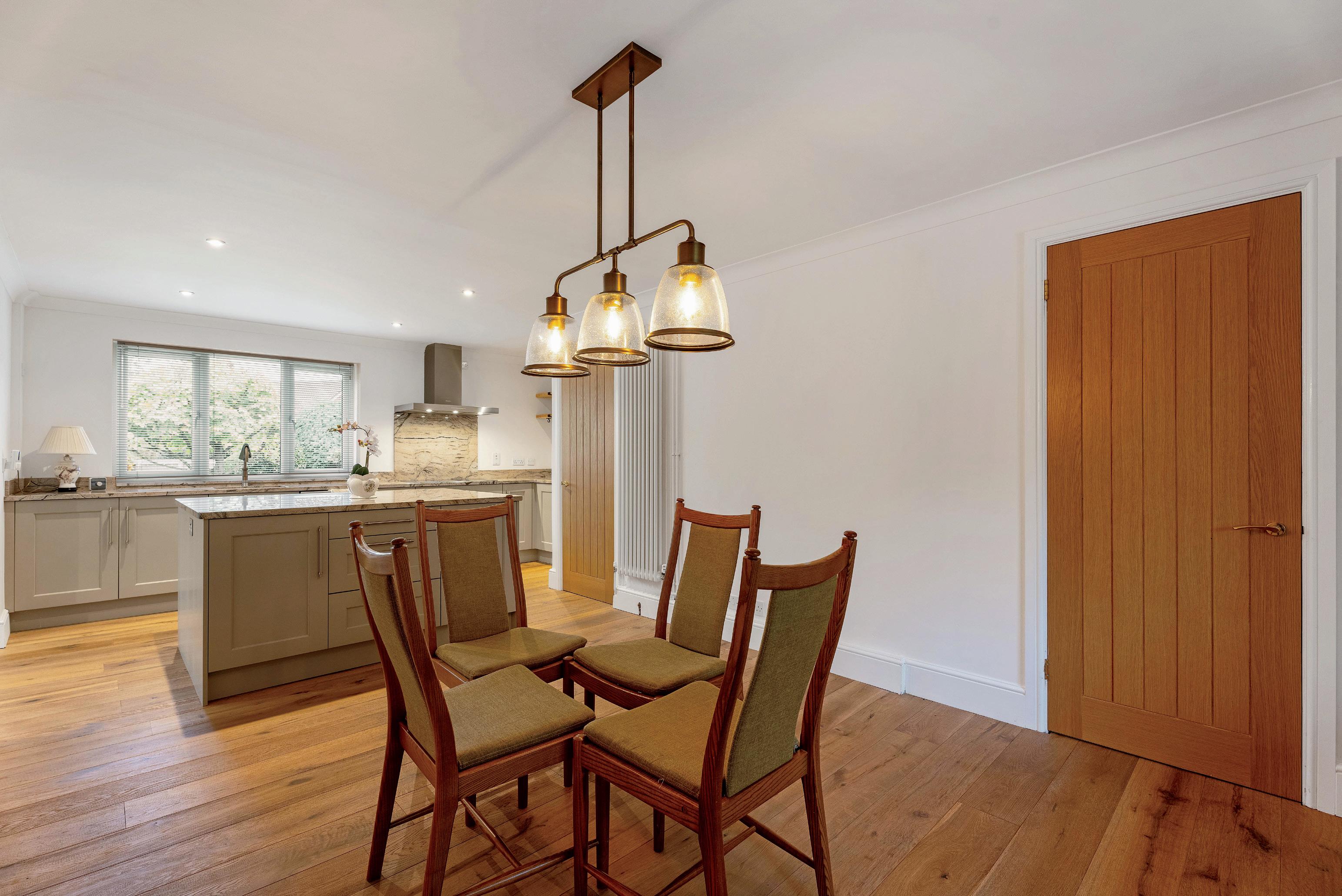 The beautiful dining kitchen has ample work space, a central island, Miele oven, Miele microwave, Miele Induction hob, Miele dishwasher, integrated Liebherr fridge, ample storage and larder cupboards, space for a table to seat eight guests and French doors to the rear.