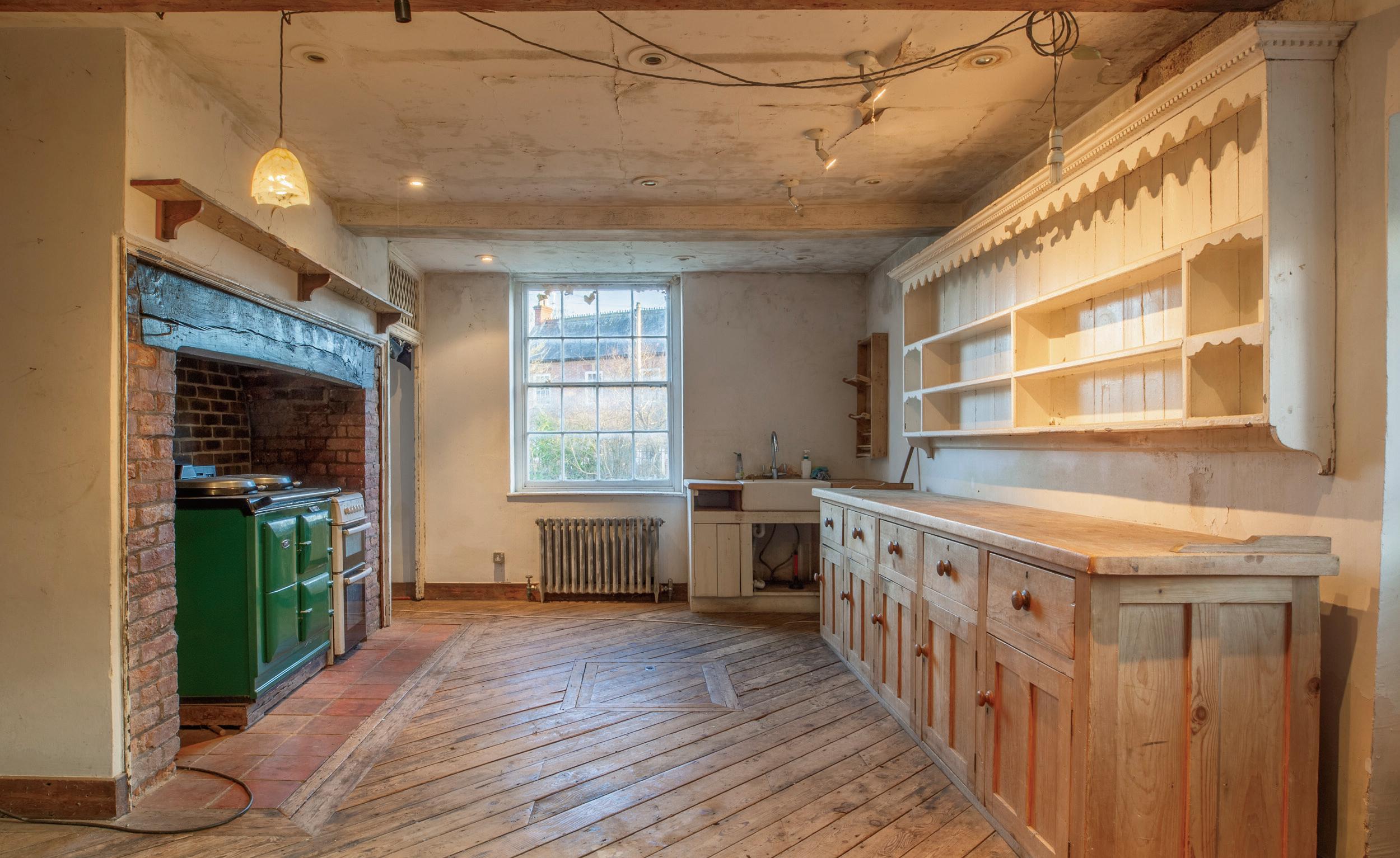 The ground floor boasts two charming and well-proportioned reception rooms. The living room highlights stripped wooden floorboards, two sash windows with views of the garden, and a currently boarded open fireplace. The dining room features similar wooden flooring, an open fireplace, and an outlook over both the garden and the front of the property. The centrepiece of the ground floor is the expansive kitchen/ breakfast room which offers direct access to the rear garden. This welcoming space includes a large inglenook with a Rayburn stove, a freestanding dresser base (included in the sale), stripped wooden flooring, and abundant natural light from a sizeable sash window.