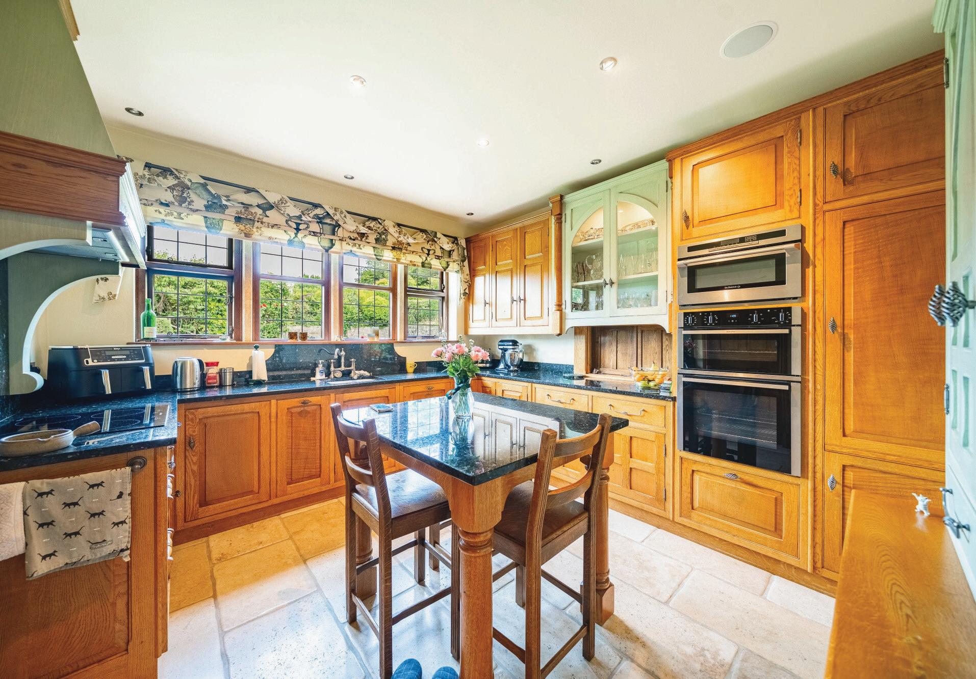 The bespoke kitchen features solid oak cabinetry, granite worktops, and a suite of premium appliances from Miele, Neff, and De Dietrich. A characterful stable door leads to the rear porch, which could be used as a breakfast room or informal dining area. A traditional panelled serving hatch connects directly to the formal dining room for ease when entertaining.