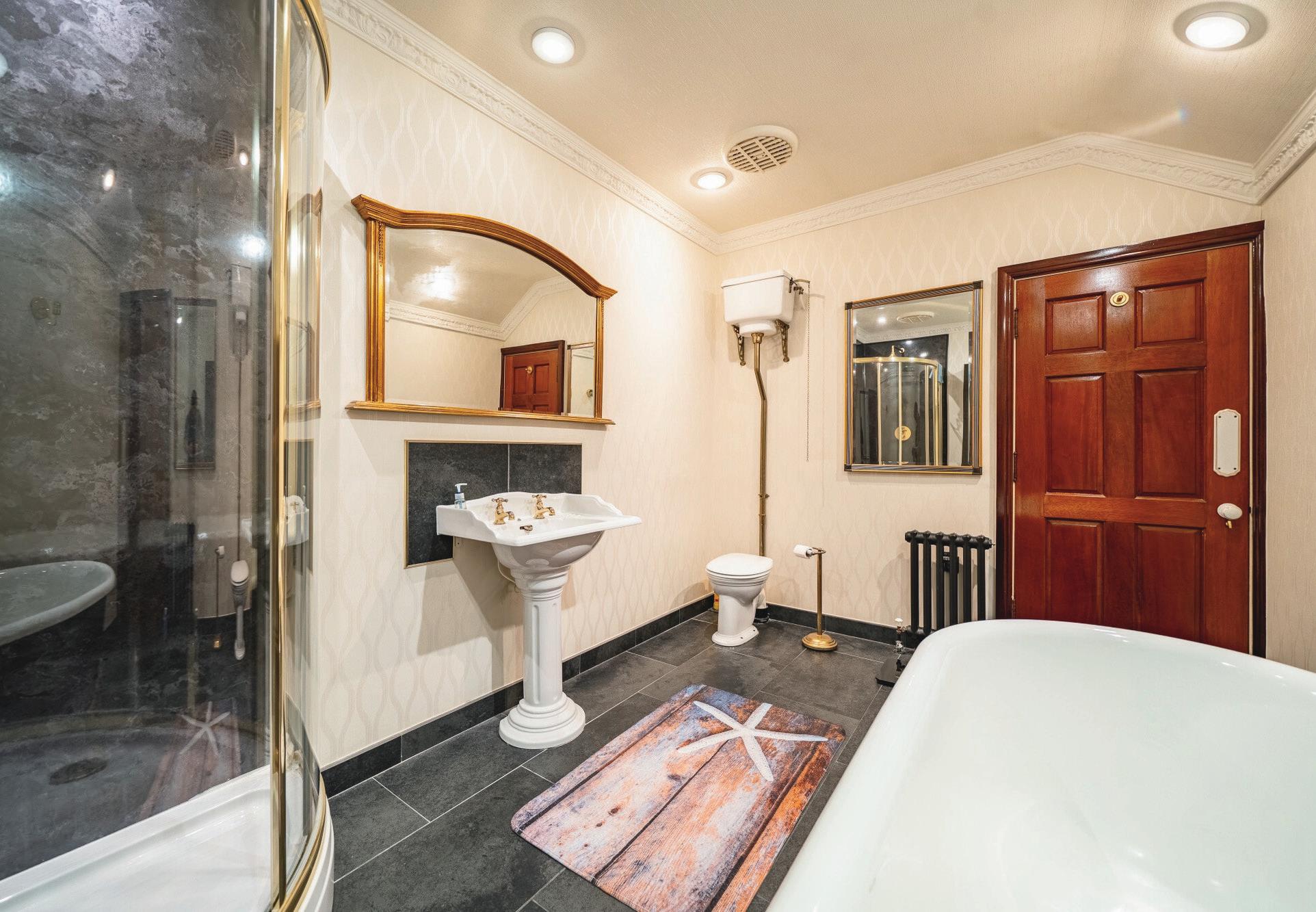 Each additional bedroom has its own unique charm, with character features including cast iron radiators, leaded windows with deep oak sills, and lofty ceilings. A second opulent family bathroom serves these rooms, similarly appointed with a roll-top bath, separate shower, and exquisite period detailing.