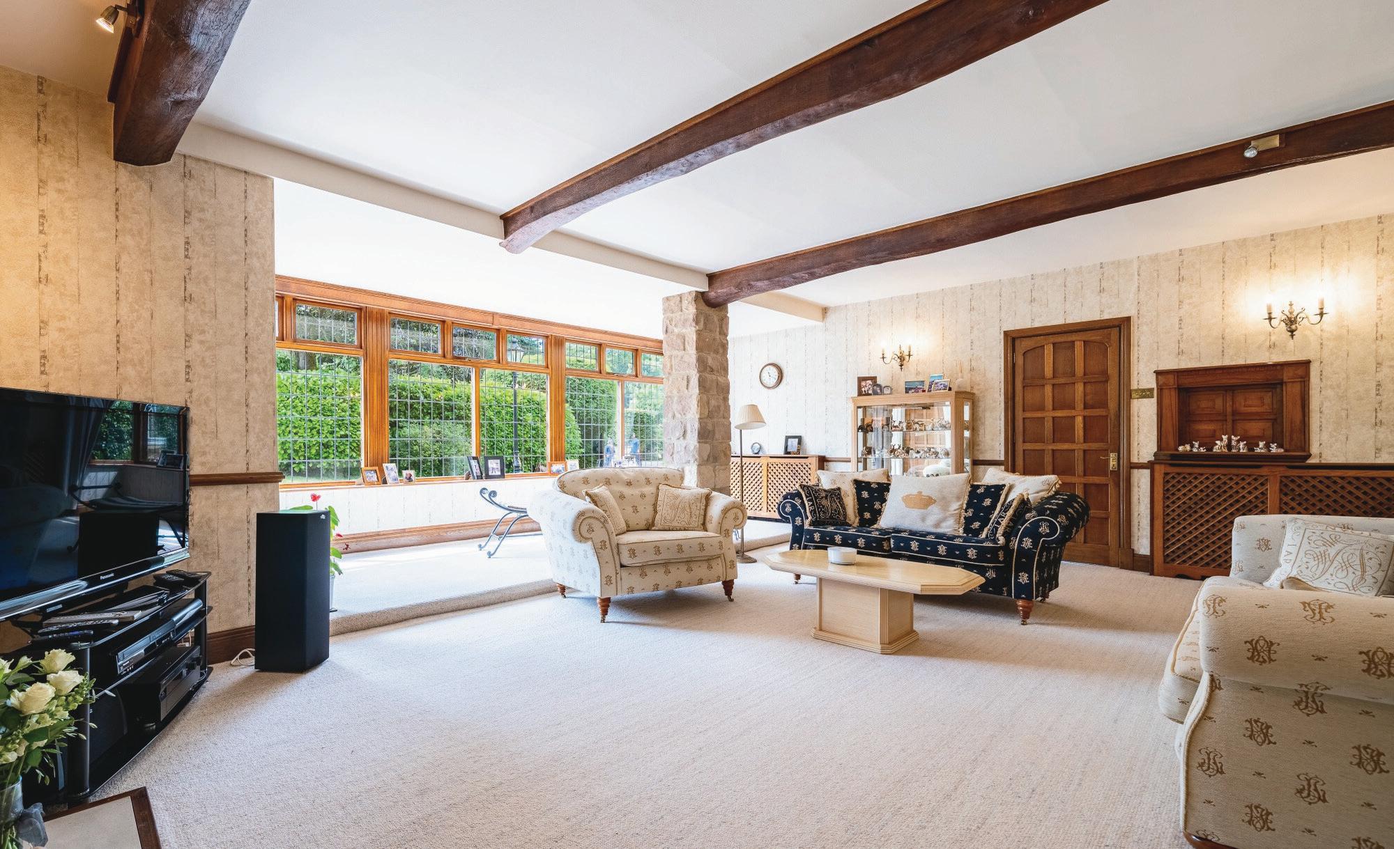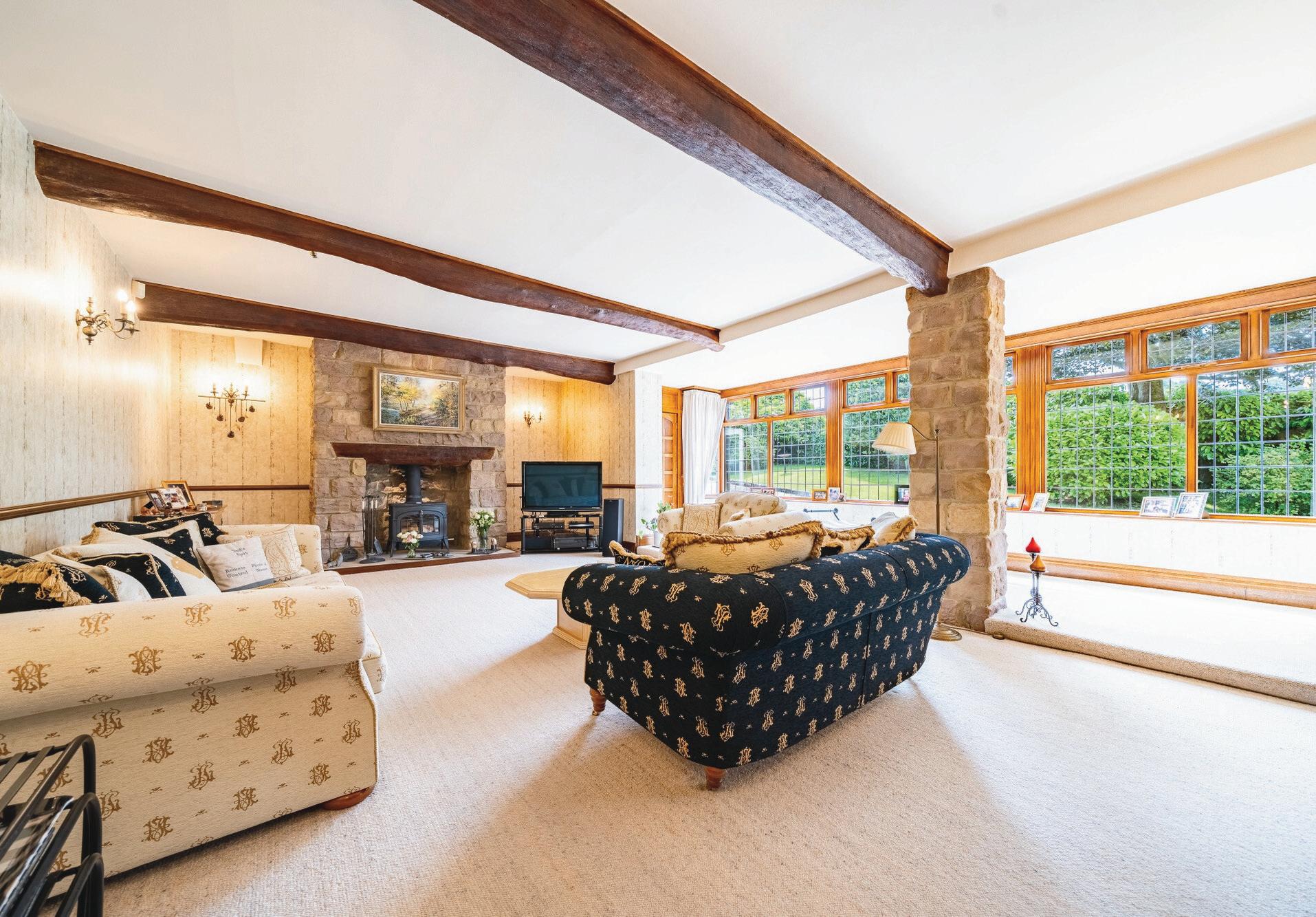 The formal sitting room is a standout, generously proportioned with high ceilings, a full-height Derbyshire stone fireplace, and a distinctive top-loading log-burning stove. A broad bank of front-facing windows floods the room with natural light and offers views over the private driveway. It’s a space that seamlessly blends comfort with sophistication, ideal for relaxed evenings or hosting guests. Adjacent to this, the games room provides a more informal retreat, perfect for leisure or adaptable to suit individual lifestyle needs.