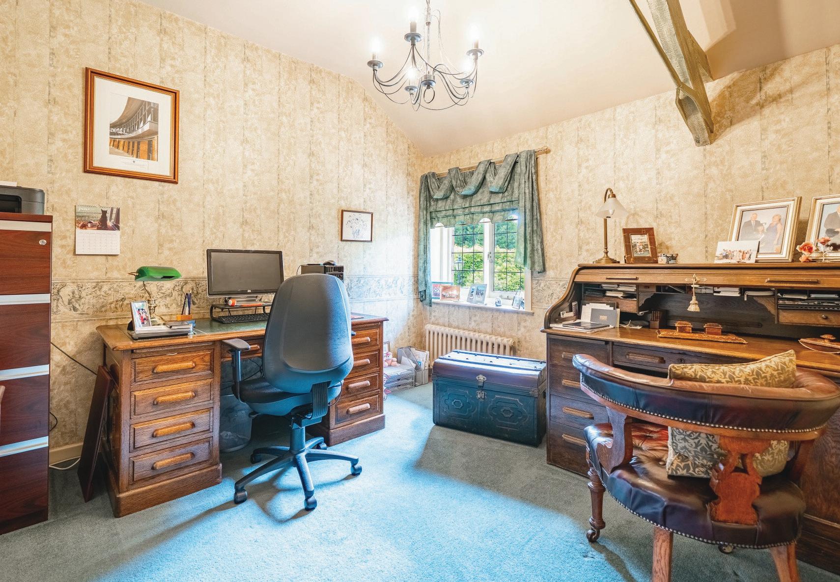 One of the bedrooms is currently used as a study, offering flexibility for remote working or creative pursuits. A spacious linen cupboard with a circular feature window adds a delightful architectural touch and further practical storage.