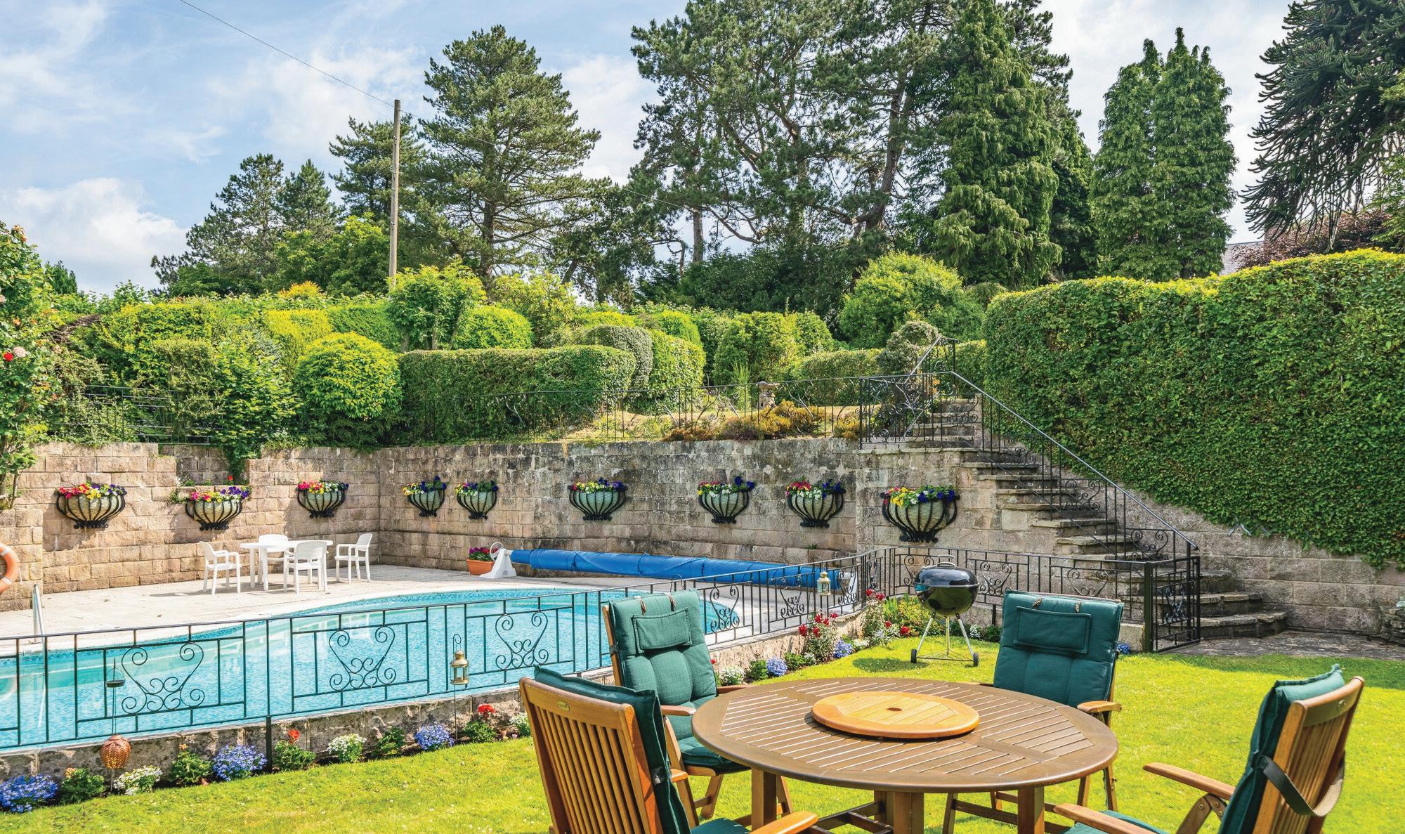 At the heart of the outdoor space lies a charming heated swimming pool, elegantly enclosed by a walled terrace with ornate ironwork, stone paving, and multiple seating areas, ideal for summer entertaining or peaceful afternoons. A characterful changing room, boiler house, and ornamental planting complete this luxurious leisure setting.
