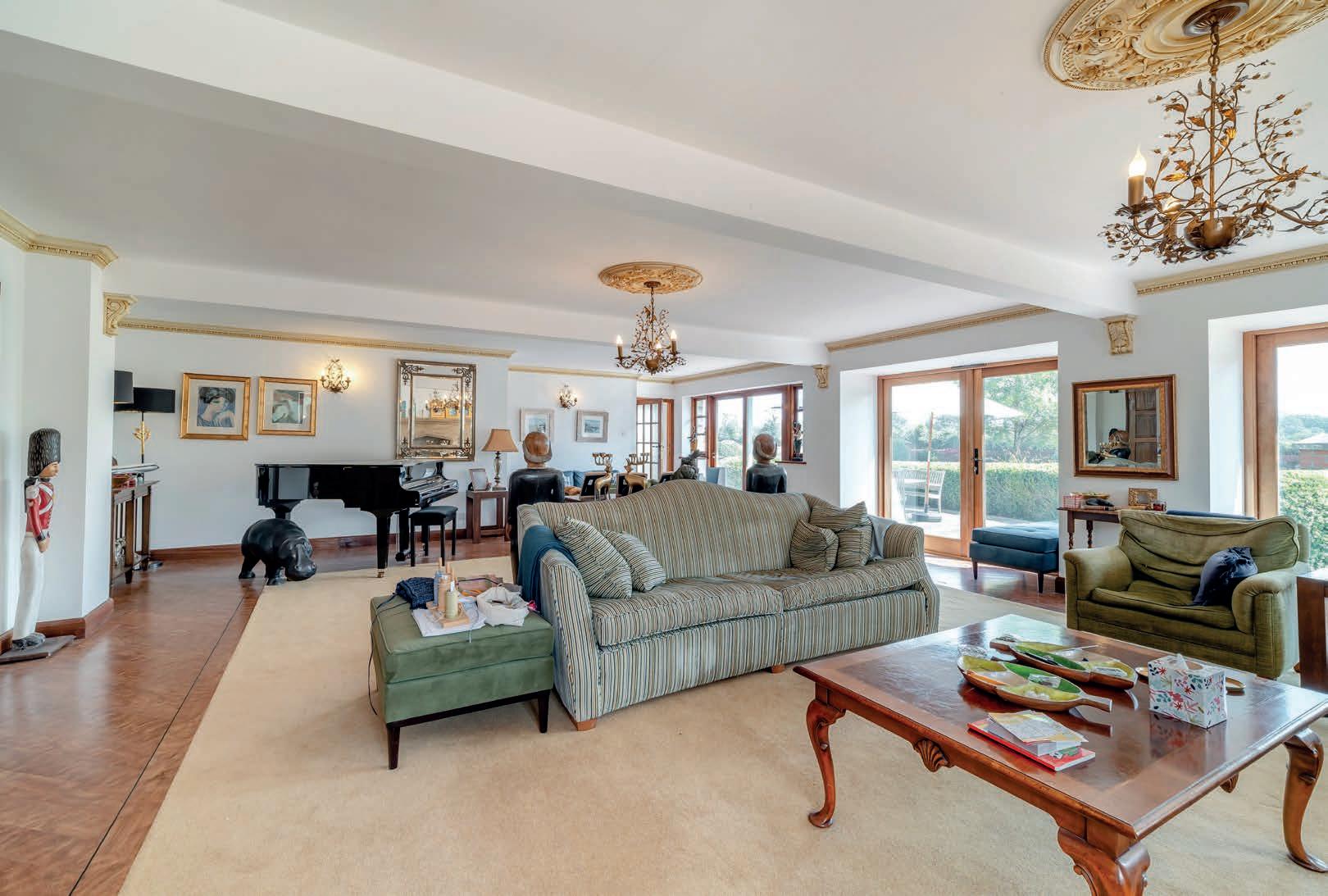 The drawing room is an inviting and vast formal living space with underfloor heating beneath natural stone flooring, a striking fireplace housing a wood-burning stove, and twin sets of double patio doors that open directly onto the sun terrace, perfect for summer entertaining.