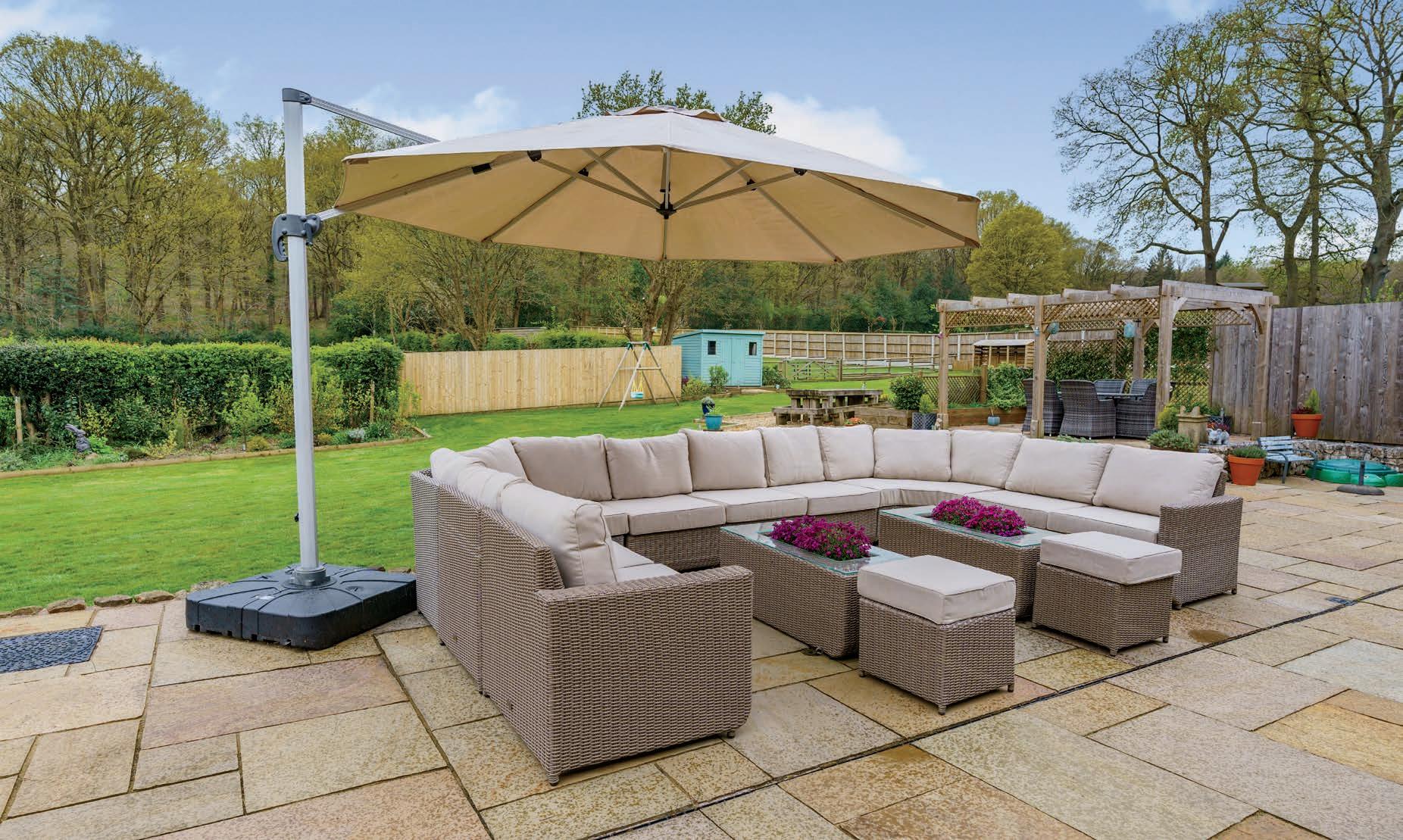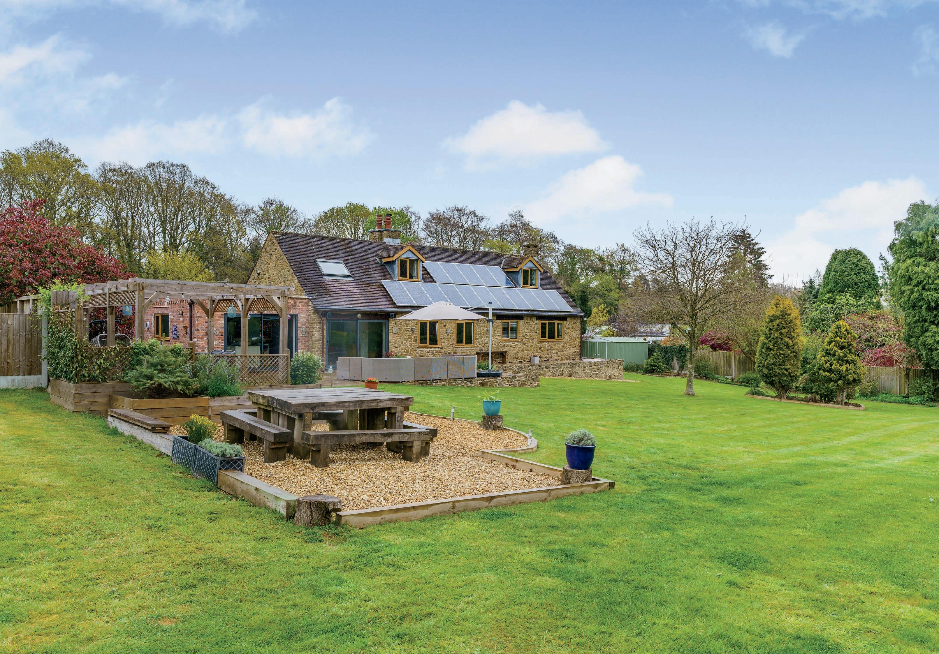 The driveway leads to a double garage with a spacious office above - ideal for home working or a creative studio. To the rear, a beautifully maintained lawn stretches out from a generous patio area accessed directly from the kitchen. This space is thoughtfully designed to include three distinct seating areas, one of which is shaded by a stylish pergola, perfect for outdoor entertaining.