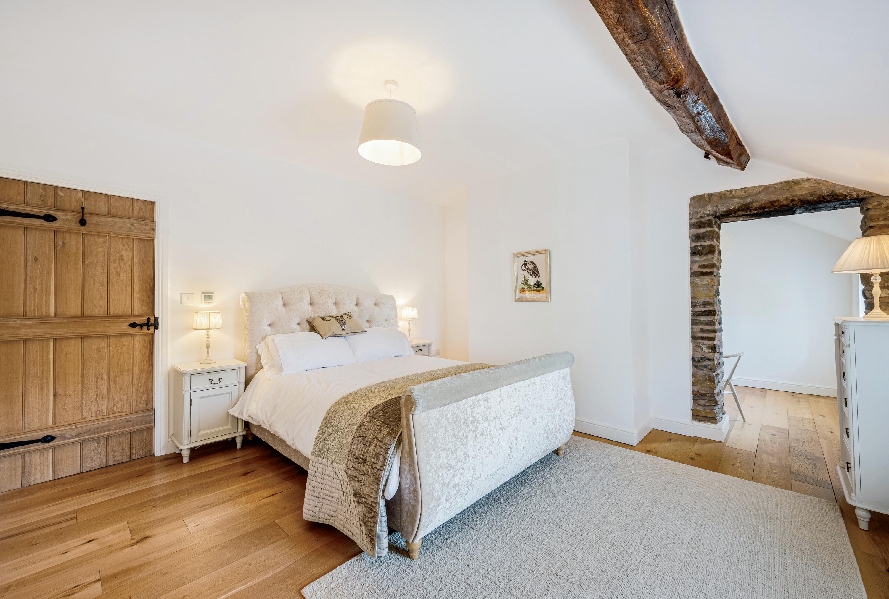 A staircase with a random stone wall on one side leads to the first floor landing, which includes a built-in storage cupboard and a Velux window. There are three double bedrooms. The main bedroom features an oak floor and a stone archway leading to a spacious dressing room, which in turn leads to a contemporary 3-piece wet room with a walk-in shower cubicle, vanity wash basin, dual flush WC, tiled floor, chrome towel rail, and Velux window. Bedroom two also has an oak floor and benefits from a 3-piece en-suite shower room, while bedroom three also features an oak floor. The internal accommodation is completed by a luxury 4-piece family bathroom, which includes a freestanding bath, walk-in shower cubicle with direct feed shower attachment, hand wash basin, dual flush WC, tiled floor, exposed random stone to one elevation, and a chrome towel rail.