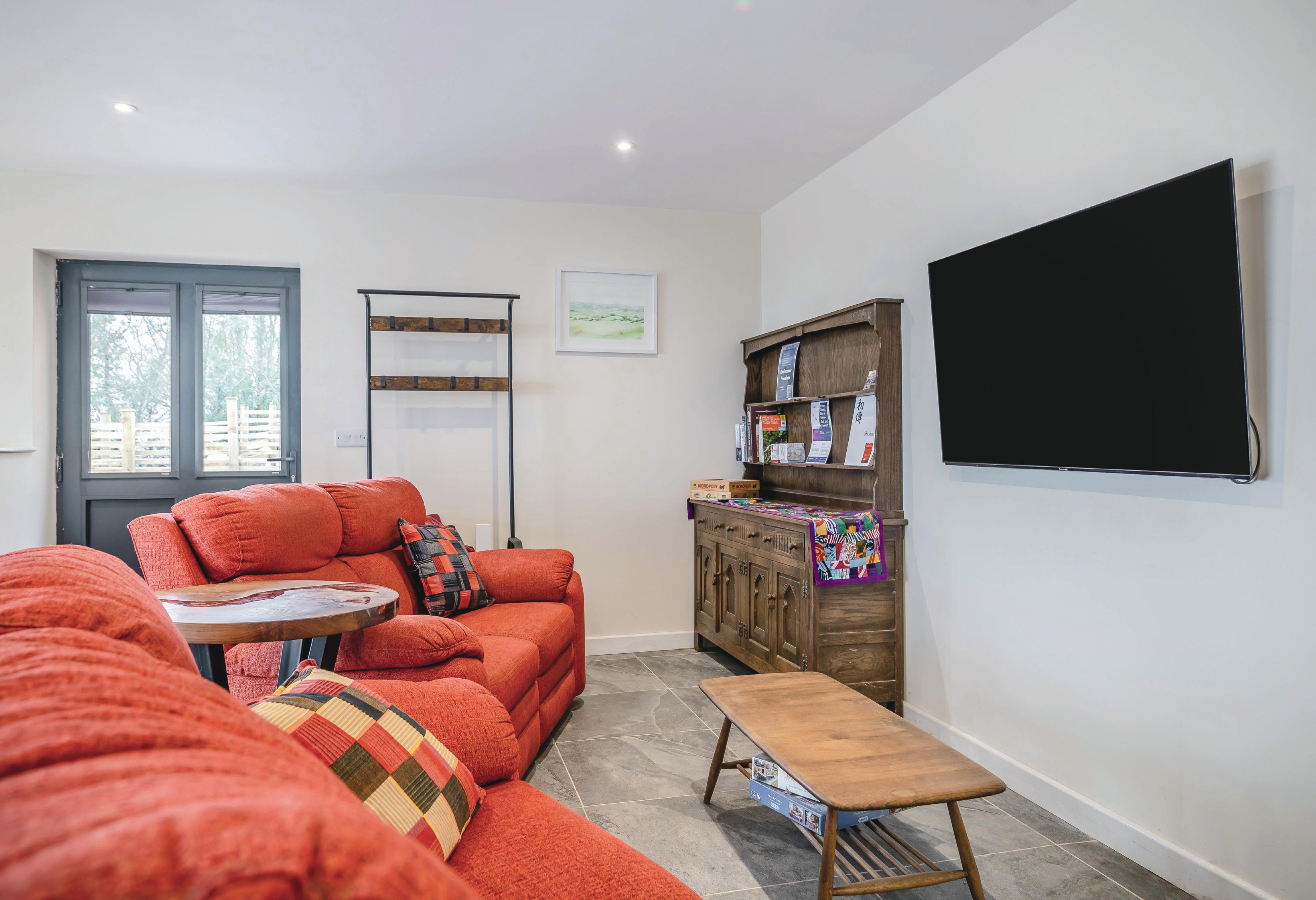 At the centre of Wych Hazel Cottage is a spacious family area, combining a fitted kitchen, plenty of space for dining, cosy sitting areas and a large storage cupboard. Sliding doors and a ceiling lantern allow plenty of light into this space and make the most of the views.