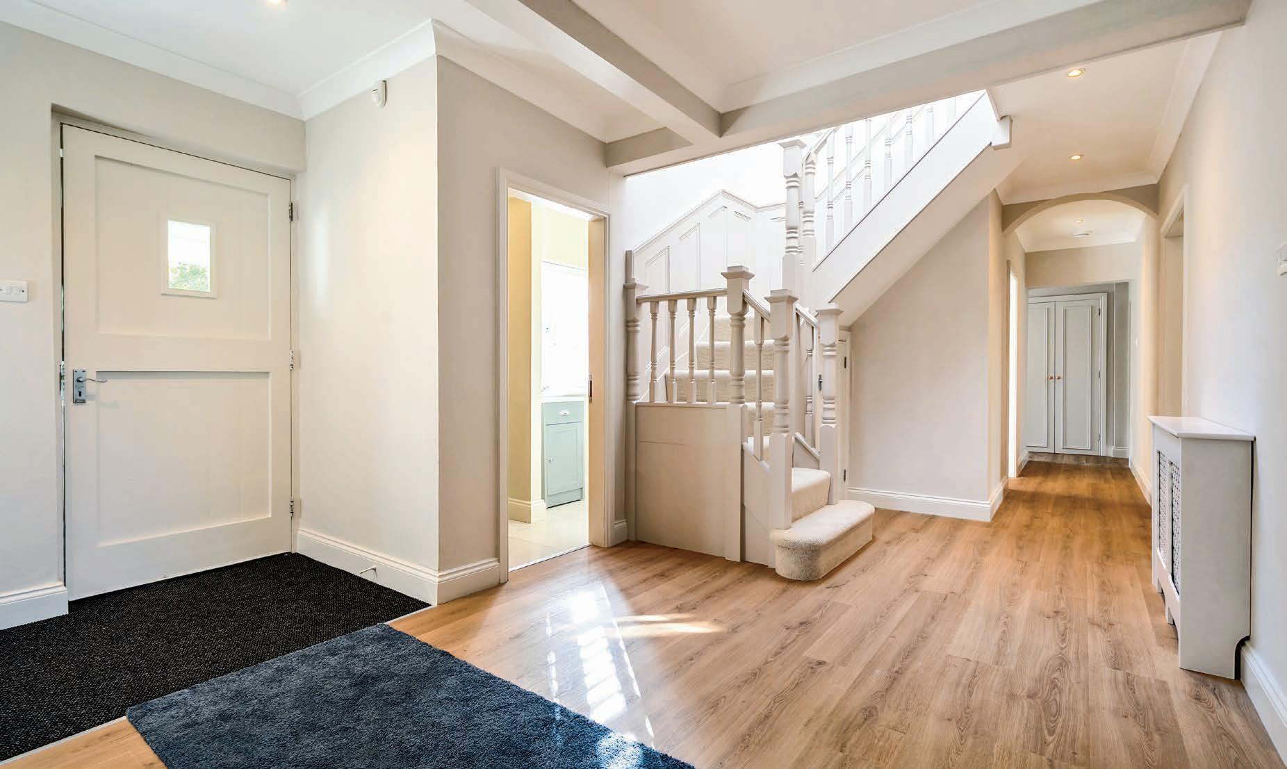 The large airy porch has a slated roof but is mainly glazed, it opens to a generous reception hallway, practically a room in itself. The staircase with an attractive carpet runner rises and the rooms start to flow…