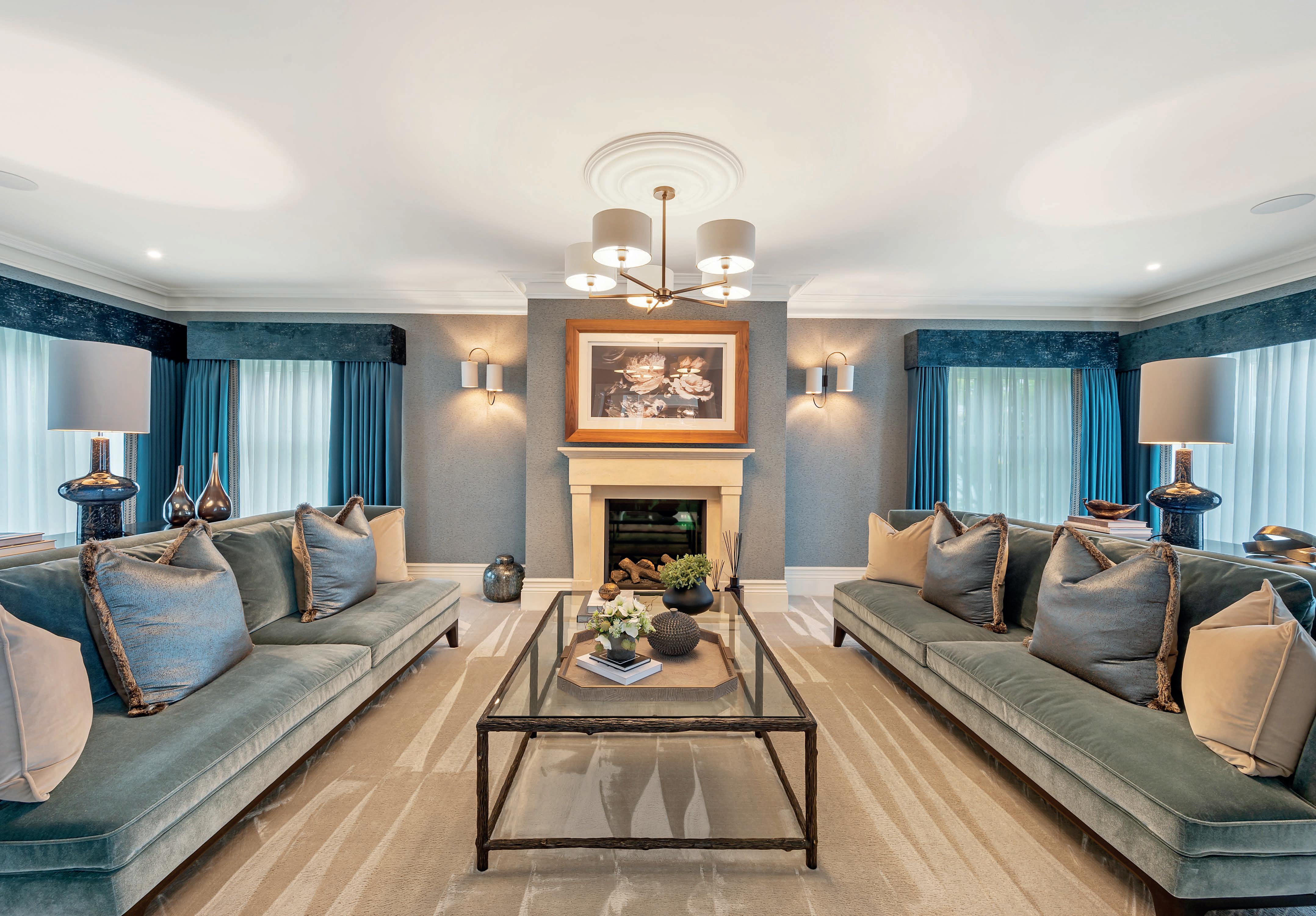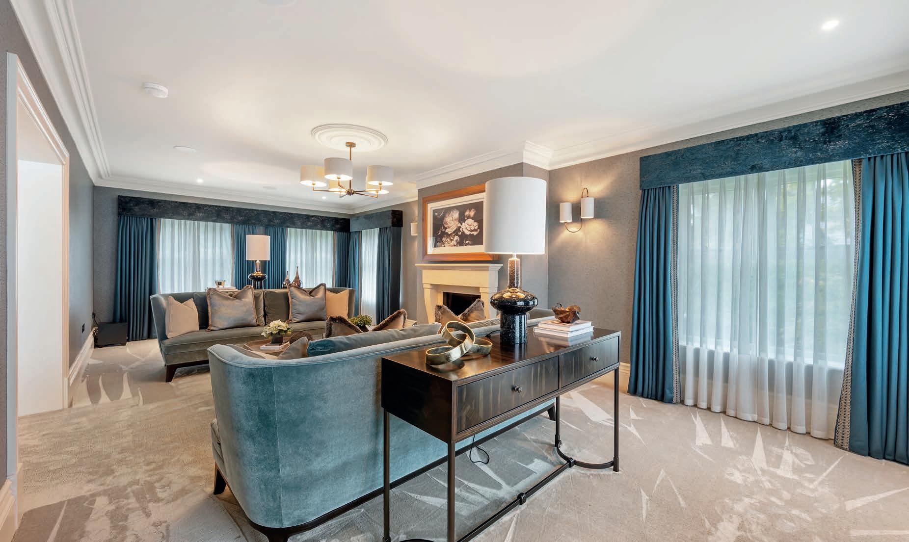 Luxurious underfoot, carpets are a wool silk blend, all from Riviera Home. These are inset to be flush with tiling in the living area of the kitchen and the dining room. The finest bespoke curtains, blinds and soft furnishings by Audrey Johns.