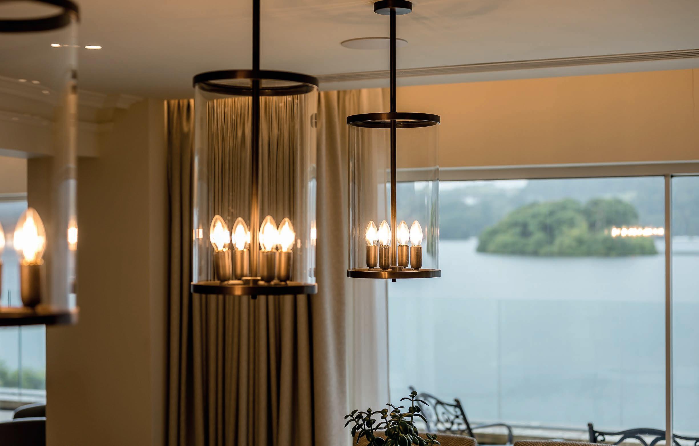 Electrically operated curtains, voiles and blinds on the lake facing ground and lower ground floor rooms.