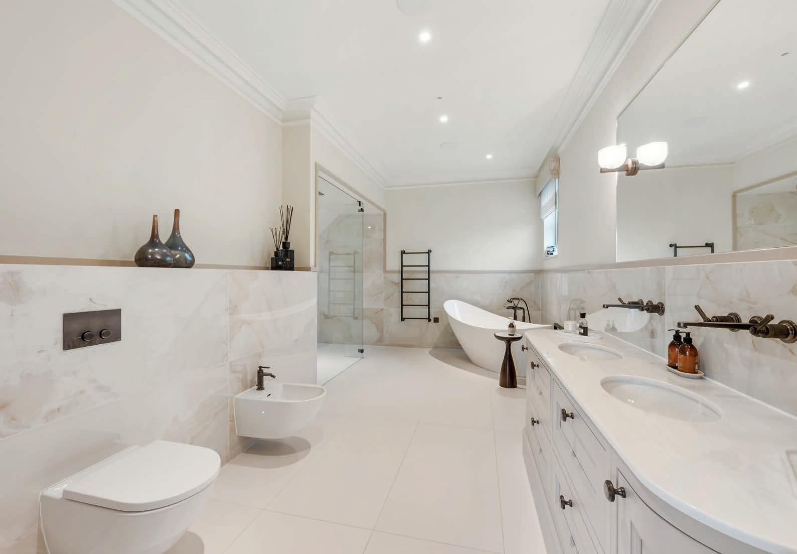 On the first floor are the principal bedrooms. The main bedroom has a dressing area and ensuite bathroom. Two further double bedrooms, both with ensuites. The second floor is occupied in its entirely by a further bedroom suite with bedroom, dressing area and bathroom. The two remaining ensuite bedrooms are on the lower ground floor, both with bedrooms, dressing areas and ensuites. Completing the lower ground floor is a plush cinema room and a games room with an adjacent well-equipped bar and servery, ideal when hosting on this floor or out in the garden. There is also the convenience of a second cloakroom.