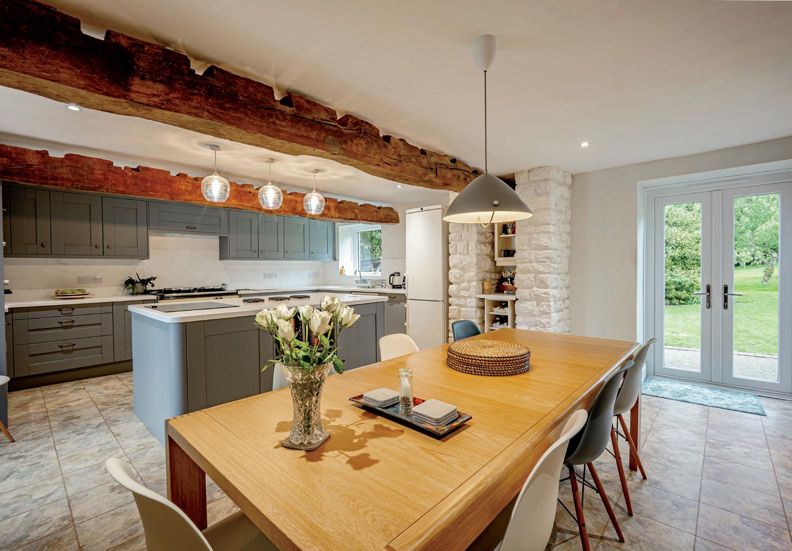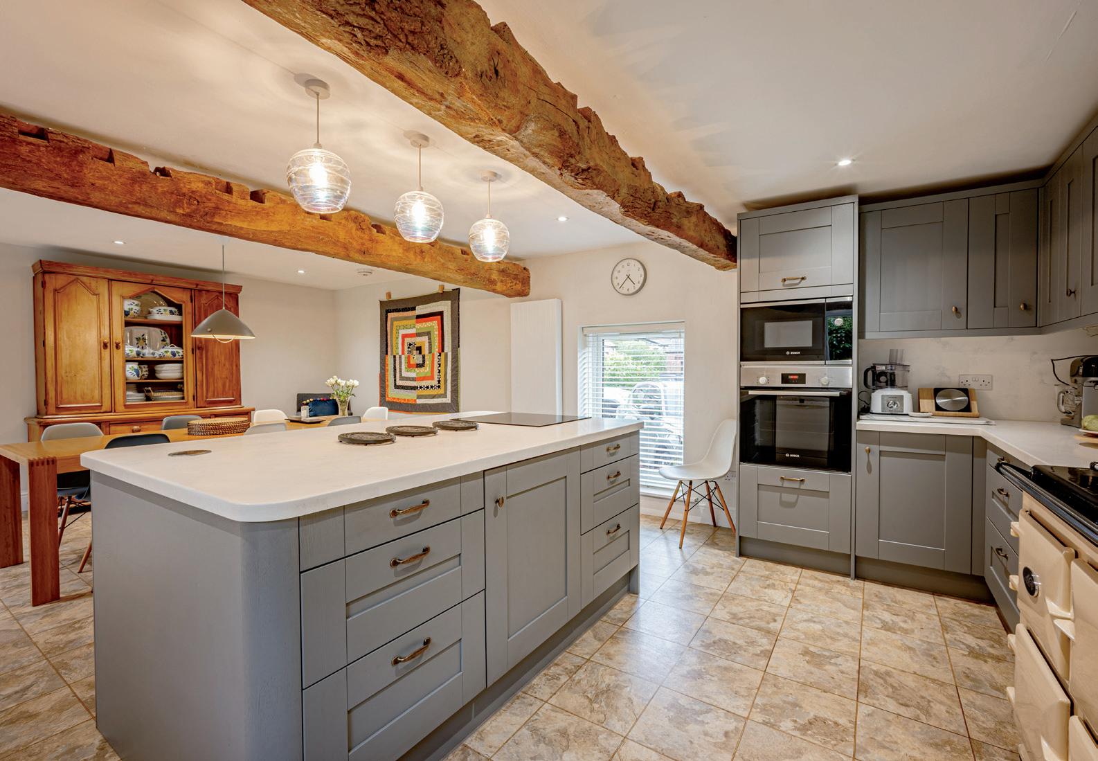 The property is entered via the door from the drive into the hall, the flooring is an attractive and hard wearing LVT which flows through several rooms downstairs giving a sense of continuity and space. The stairs and main ground floor rooms lead from here. The open plan, kitchen/diner was fitted four years ago by the current owners, retaining all its original charm with exposed beams. It has an excellent range of floor and wall mounted cupboards, a sizeable island with pendant lights over and attractive white worktops and matching splashbacks. There is an electric Aga and an extractor, an additional electric fan oven, grill and microwave, and a four-ring ceramic hob, all from Bosch. The flooring is tiled and there is ample space for the dining table. Patio doors open out onto the patio and garden.