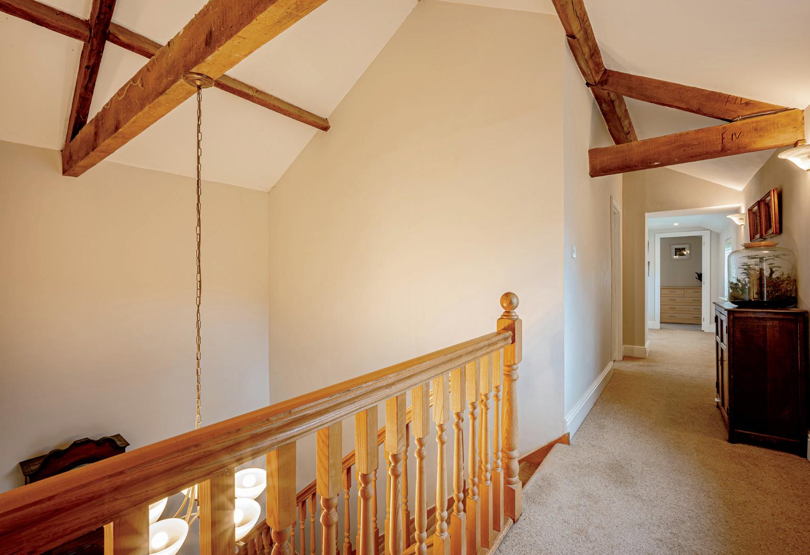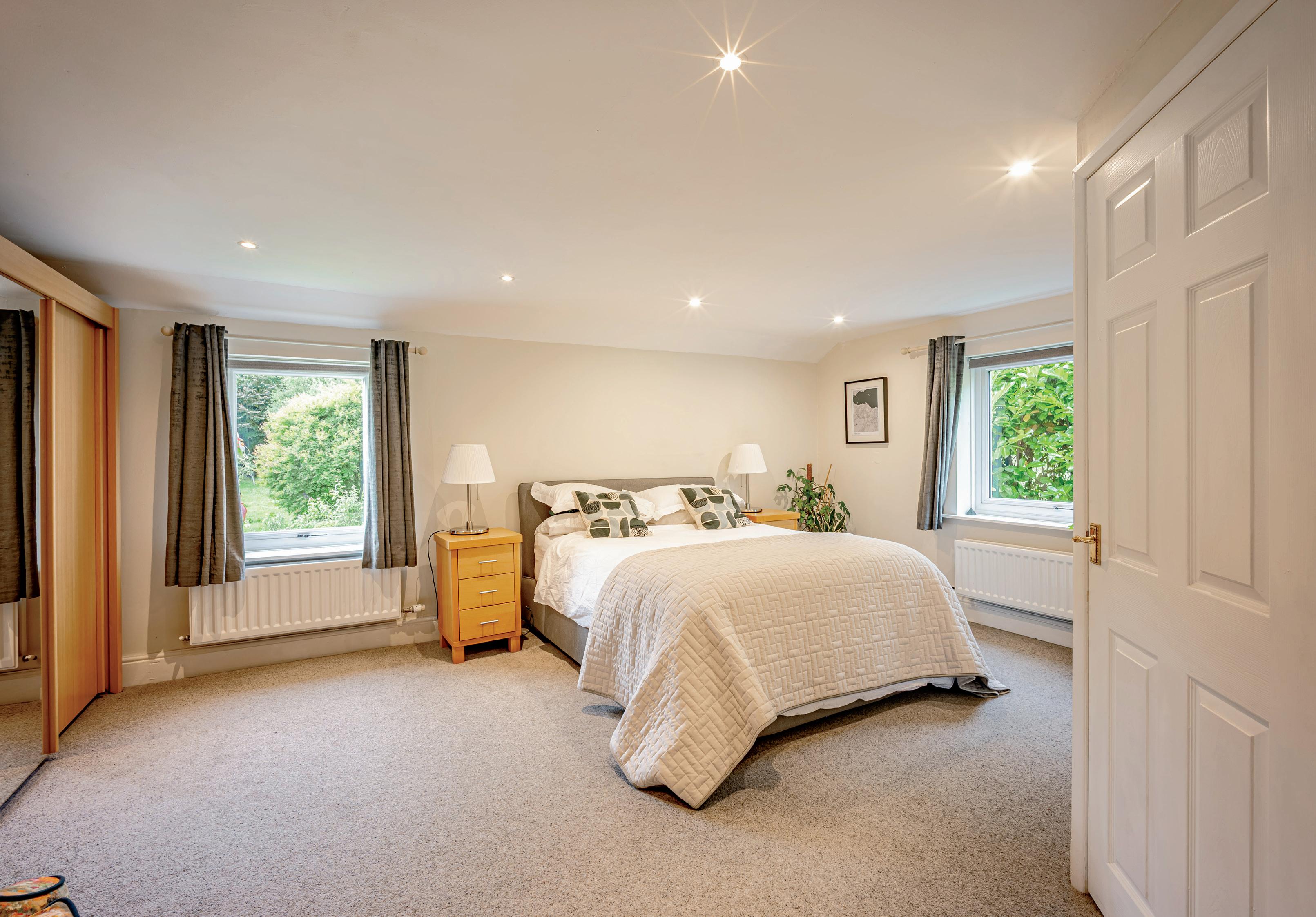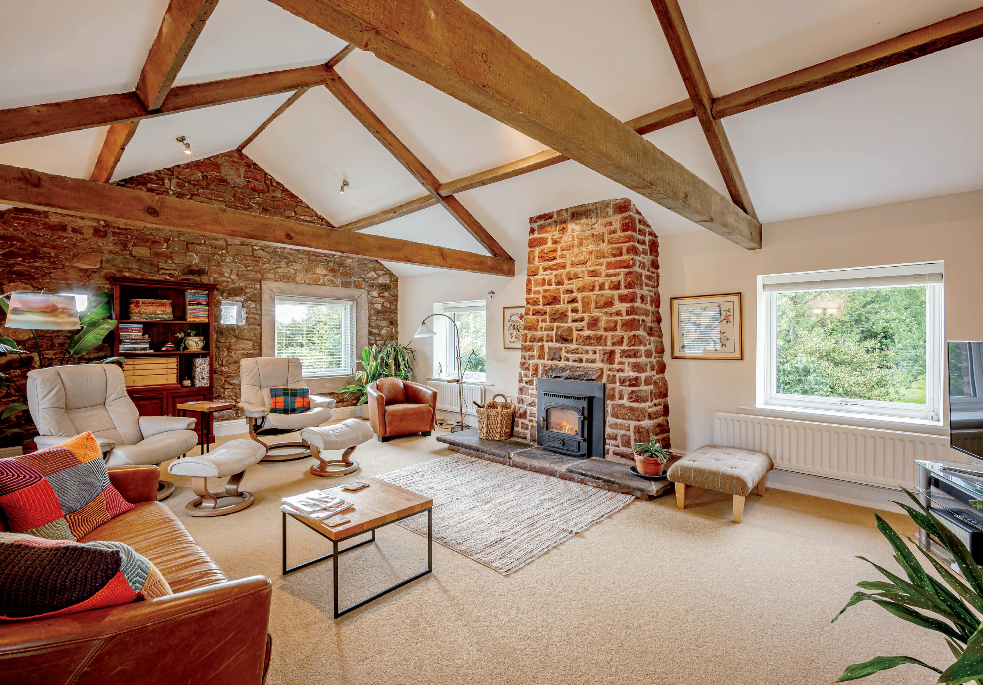 The first floor has two further bedrooms, one with an ensuite, a second family bathroom and an impressive living room. The living room on this floor is full of character, it has a vaulted ceiling with exposed beams and a Clearview wood burner in a feature stone chimney breast. It is a triple aspect with lovely views onto the garden. There are two further double rooms on this floor, one has an attractive exposed stone feature wall with exposed beams. The master bedroom is sizeable, bright and beautifully presented. It has an ensuite with shower, wc, countertop sink and ample storage. There is also an airing cupboard housing the hot water cylinder and a second family bathroom comprising a shower, separate bath and built in sink wc and towel rail.