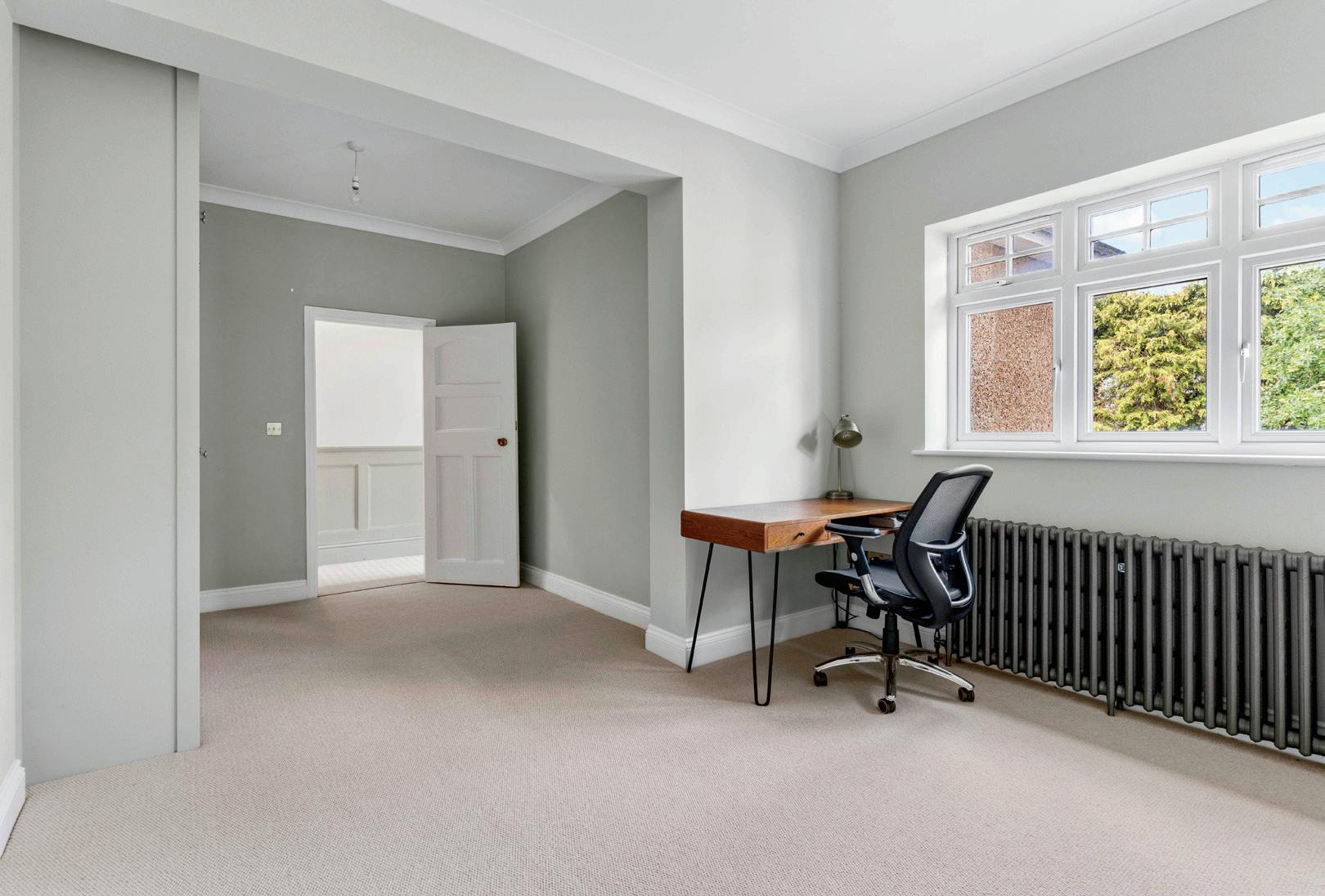 Sweeping up to the first floor, you’ll find a stunning principal bedroom suite featuring a bay window with far-reaching views toward London, a charming natural stone fireplace with electric fire and heater, a luxurious en suite wet room with underfloor heating, and a spacious dressing room fitted with bespoke wardrobes. Two additional double bedrooms and a stylish four-piece family bathroom, also with underfloor heating, complete this level. The balustrade staircase continues to the second floor, which offers three further bedrooms, one converted to a home office with panoramic views of London’s skyline and surrounding fields. A modern shower room with contemporary finishes serves this floor.