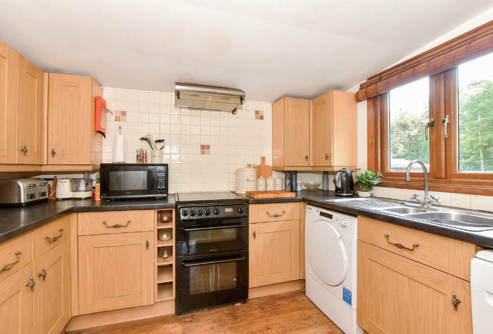 Situated off a quiet, country lane, down a private driveway, in a picturesque location surrounded by fields and woodland, lies this idyllic, pretty cottage with a large, enclosed garden, bordered by a quaint, picket fence and ample parking for numerous vehicles as well as a garage. Inside you’ll find a well-equipped, contemporary kitchen complete with space for a dishwasher and tumble dryer as well as the American style fridge freezer. This opens out via an archway into the spacious sitting room that’s bathed in natural light from the French doors and dual aspect windows, and which boasts an attractive wood burning stove.