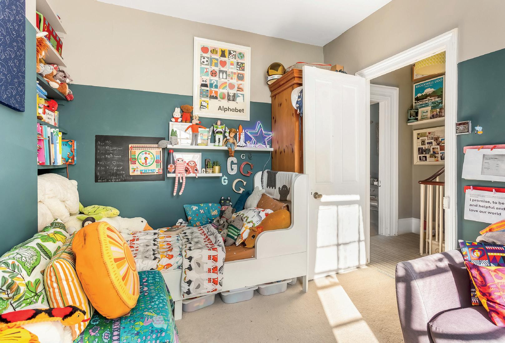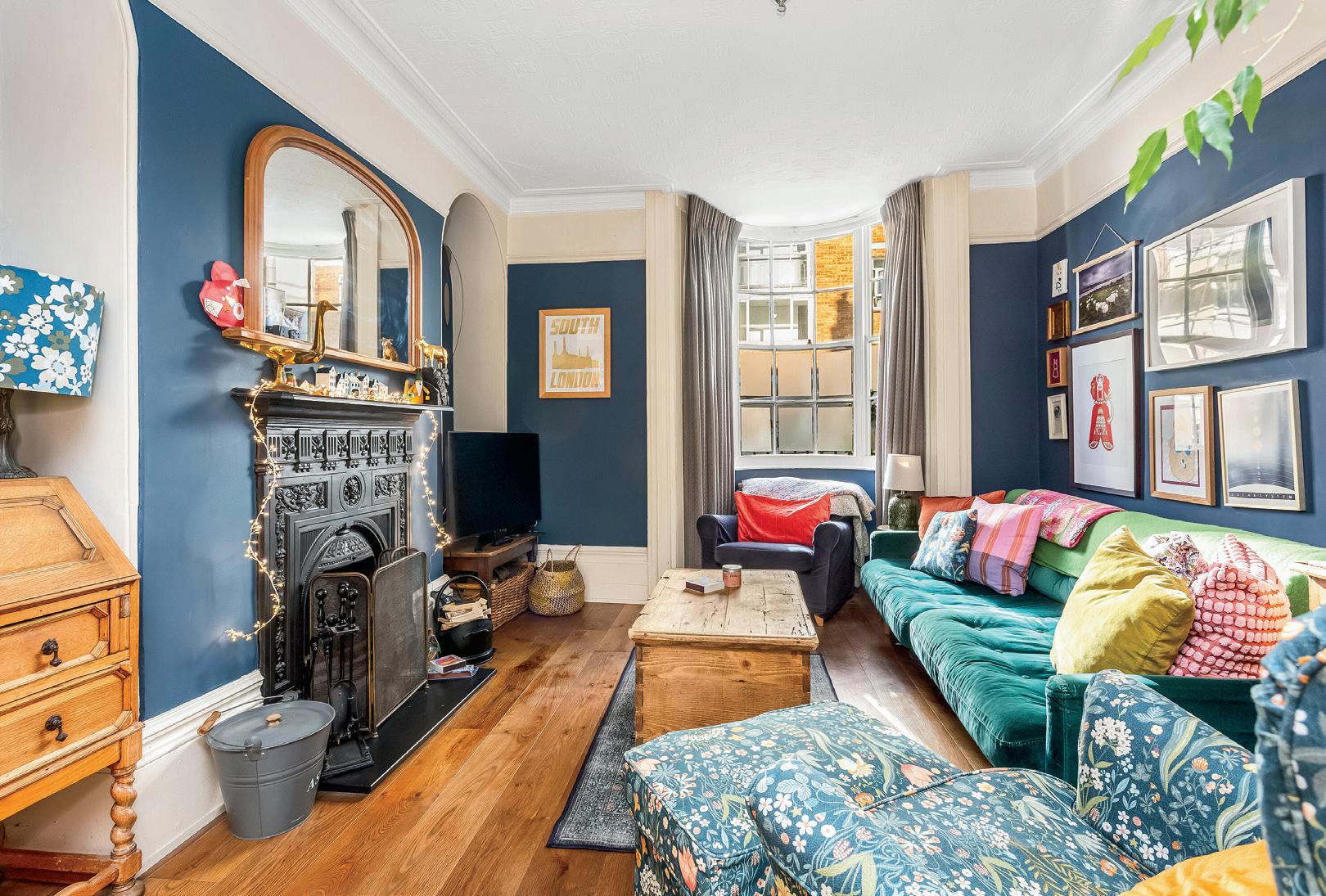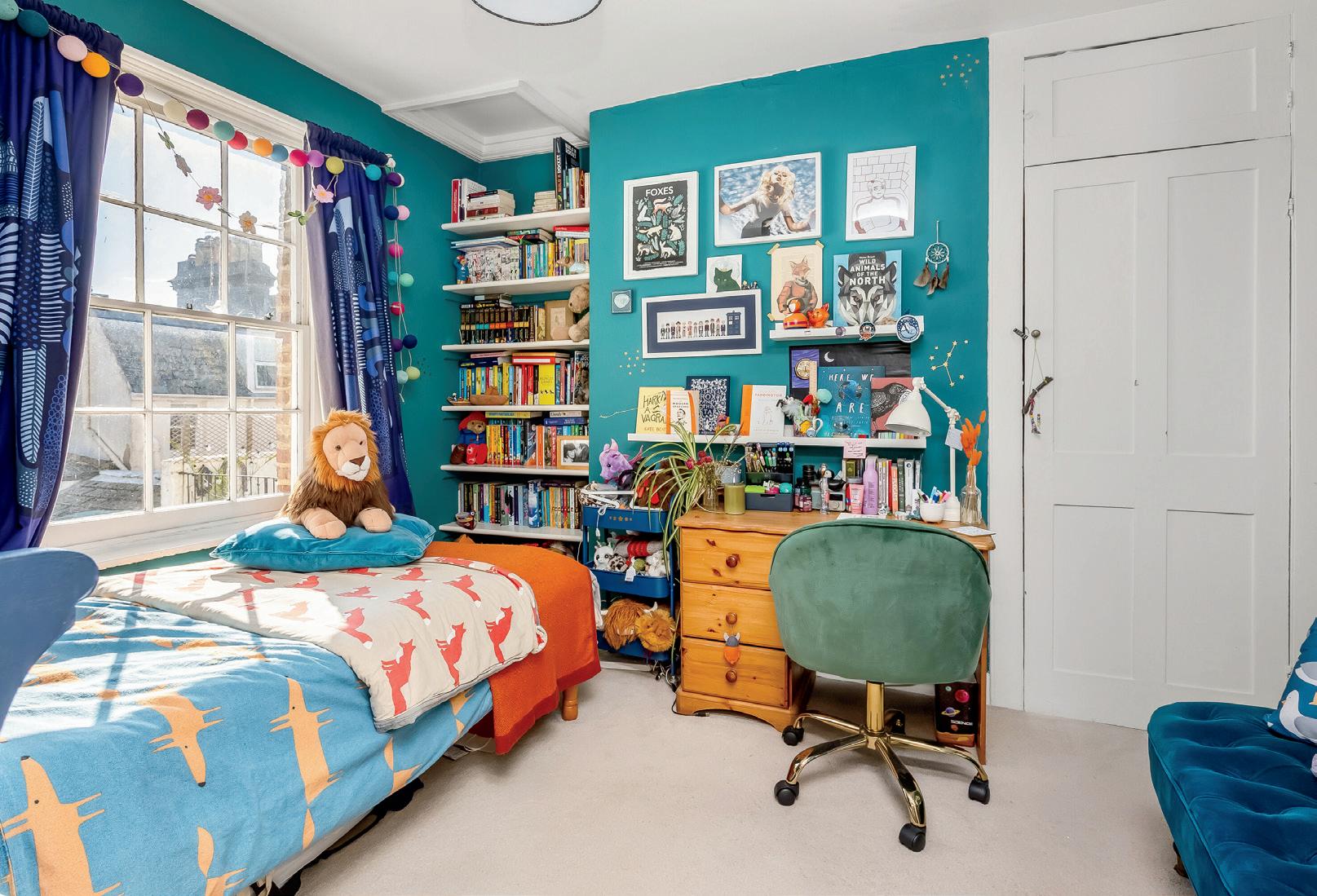Farrow and Ball Inchyra Blue painted walls and soft oatmeal carpet are in the adjacent bedroom, chimney breast alcoves add to the floor space and a sash window offers views of the Brighton rooftops.