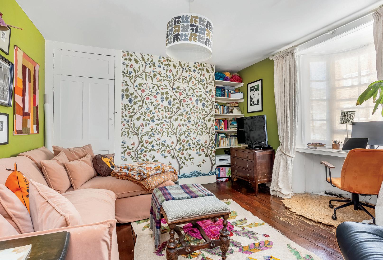 A leaded, stained glass door opens onto the hallway and beautifully lights the warm tones of the engineered wood floor that stretches out across the ground floor of this welcoming townhouse.