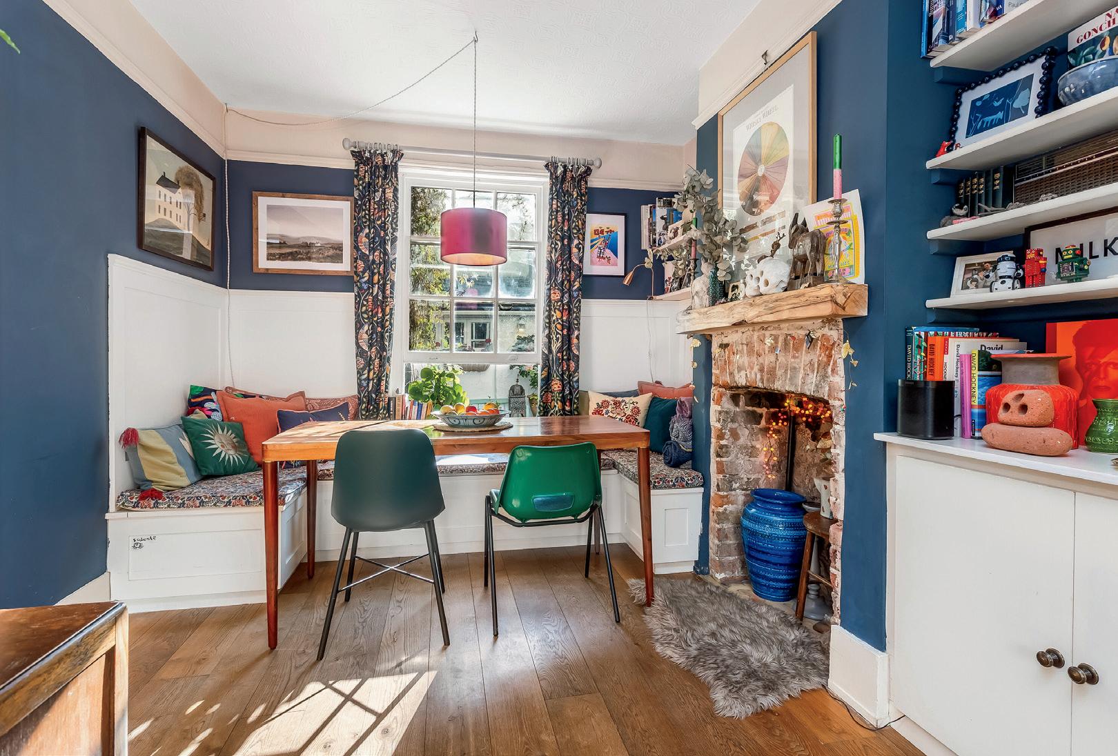 A multi-paned sash window overlooks the pretty enclosed courtyard from the dining room and elegant Farrow and Ball Stiffkey blue walls adds to the charm and character of the space.