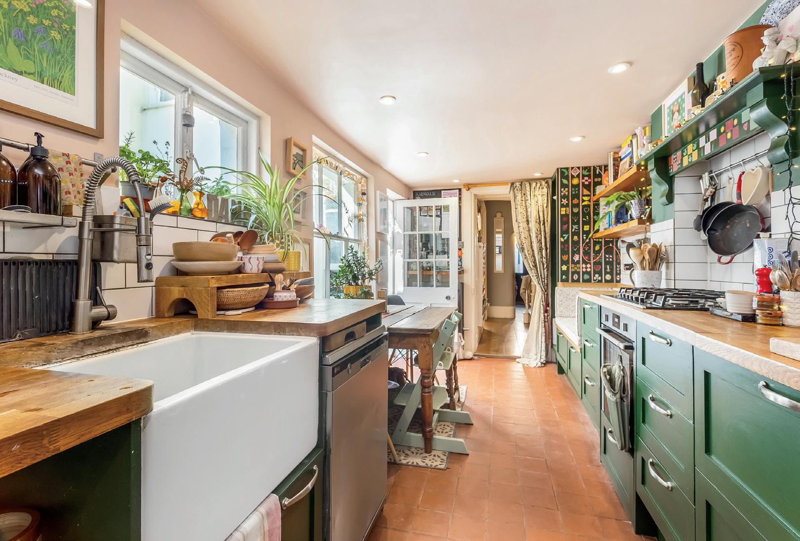 Wood worktops sit beneath sleek white metro tiles in the family-sized kitchen. Fully fitted with a wealth of heritage green cabinets, deep butler sink and integrated appliances, there is plenty of space for a breakfast table and a cosy built in bench. The pantry at the far end provides invaluable storage and a demi-glazed door opens directly onto the enclosed, pretty courtyard.