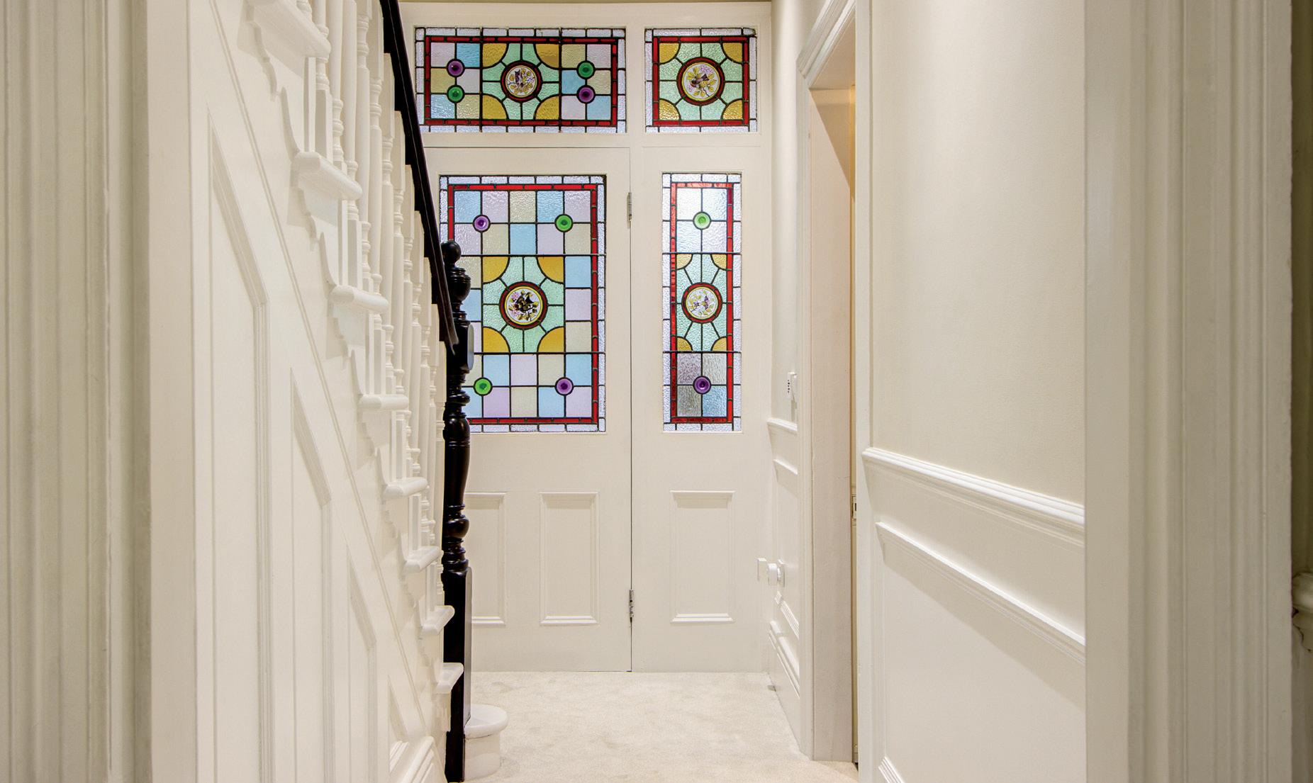 Approached via a private entrance, an expansive driveway provides ample parking for several vehicles. It leads to the side of the property, where a convenient entrance opens directly into the kitchen. At the front, a charming, meandering path guides you to the formal entrance, where a welcoming vestibule awaits. Here, beautiful period tiles and a striking stained-glass window immediately set the tone, showcasing the character and craftsmanship that define this exceptional home.