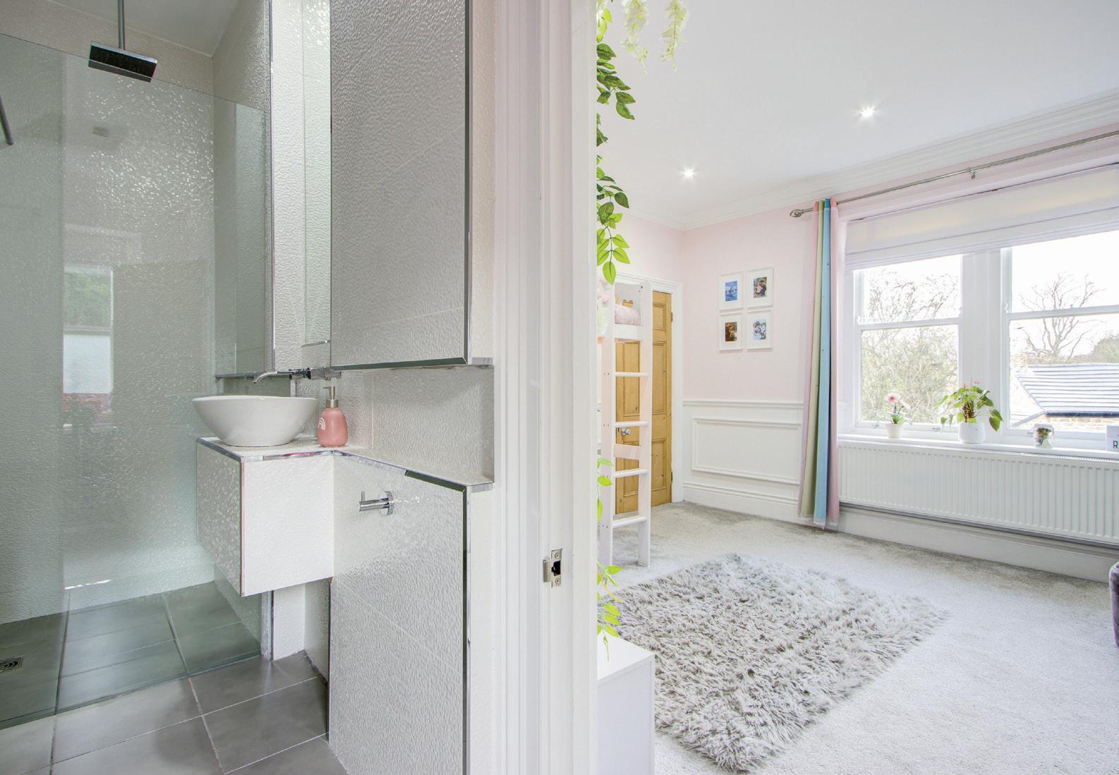 The principal suite is a true sanctuary, complete with a private balcony overlooking mature trees and landscaped gardens, the perfect spot to enjoy morning coffee or relax as the sun sets. Its stylish en-suite bathroom with undefloor heating exudes indulgence, featuring a freestanding bath and a separate walk-in shower, offering a spa-like retreat within the home.