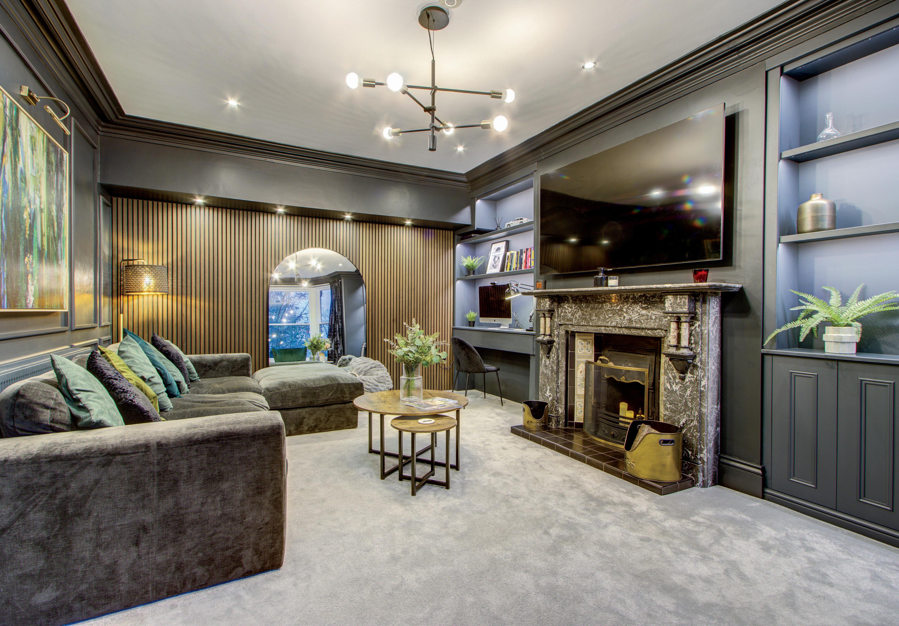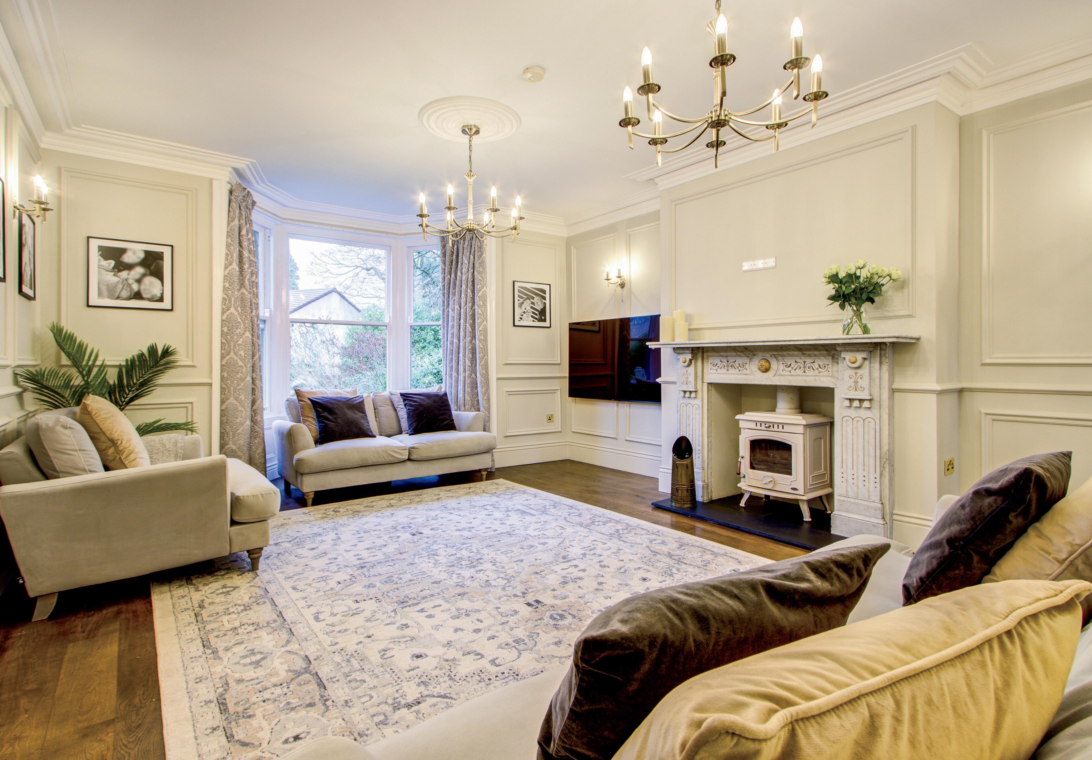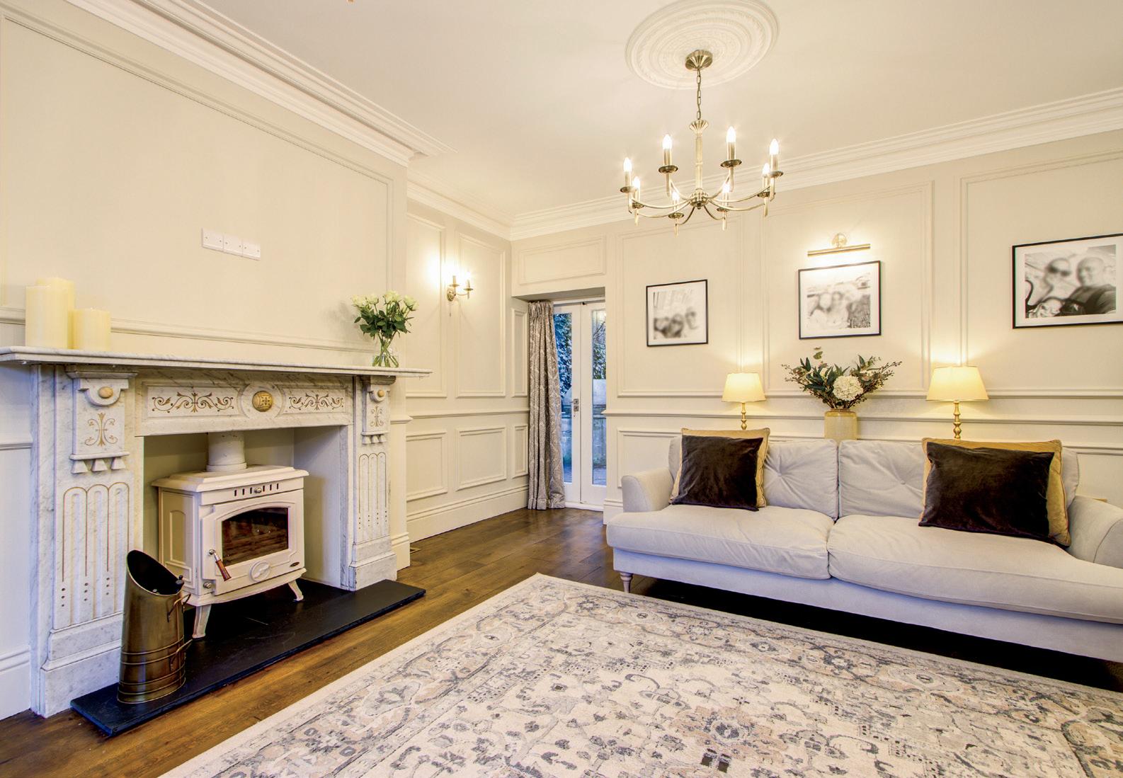 To the front of the home, two beautifully appointed reception rooms with elegant bay windows offer versatile living spaces for every occasion. The living room, with its rich tones and feature working fireplace, provides a cosy retreat on cooler evenings. Next door, the sophisticated drawing room, complete with a charming wood-burning stove and classic period detailing, opens directly onto the rear garden, offering an inviting setting for relaxation or entertaining.