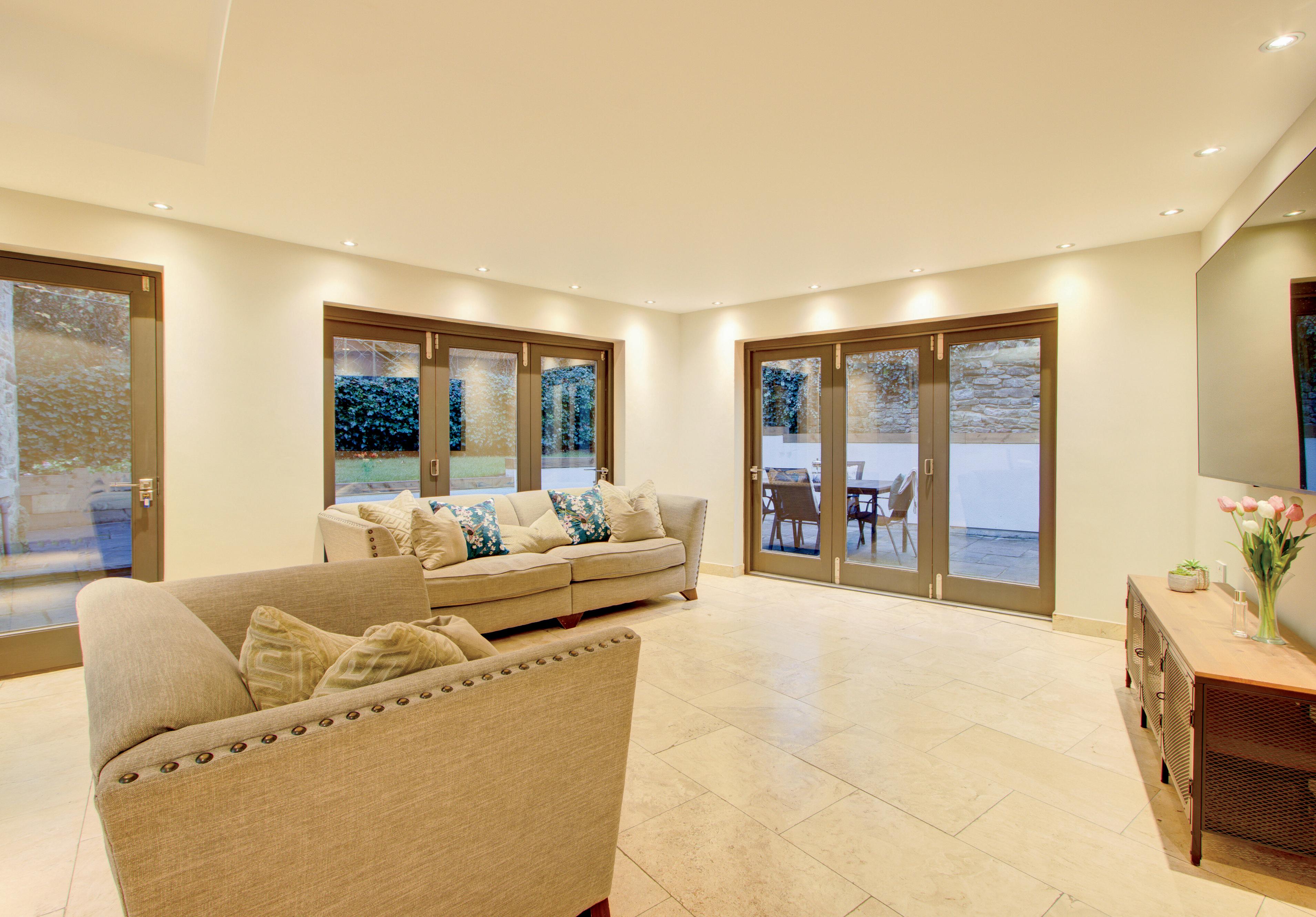 To the rear, the southwest-facing garden extends effortlessly from the family room, creating a wonderful sense of indoor-outdoor living. A spacious patio area, complete with a pizza oven, provides the perfect space for alfresco dining and entertaining. Raised beds offer opportunities for homegrown produce, while a wood store and thoughtfully placed feature lighting ensure the garden remains inviting and atmospheric well into the evening.