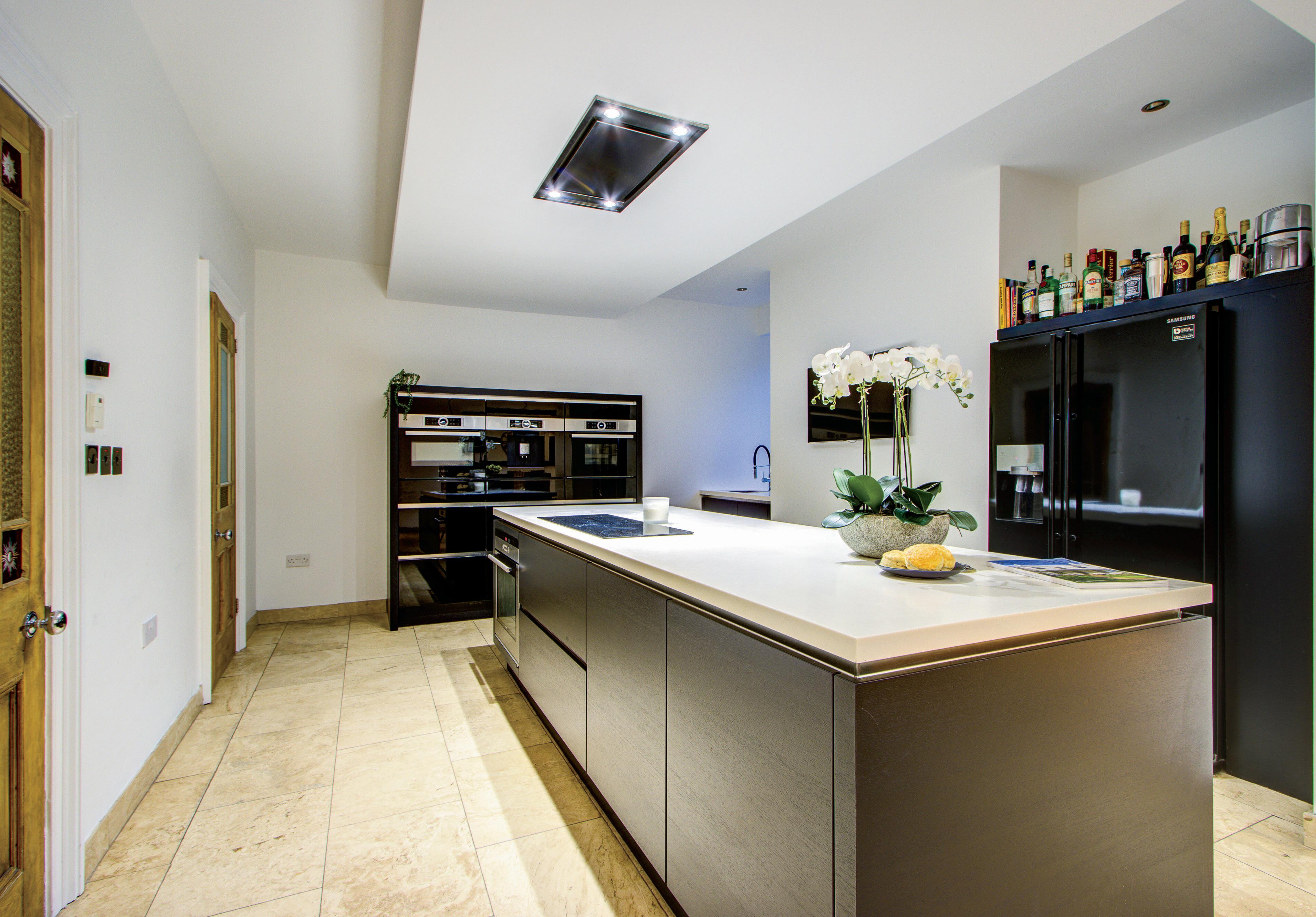 At its heart lies a fabulous open-plan kitchen, dining, and family area, a space designed with both style and practicality in mind. The sleek contemporary kitchen features a large central island and a walk-in pantry, while the generous dining area is ideal for family gatherings or entertaining friends. Bifold doors from the family room open seamlessly to the rear garden, creating a perfect indoor-outdoor connection. Underfloor heating runs throughout this versatile space, ensuring year-round comfort and warmth.