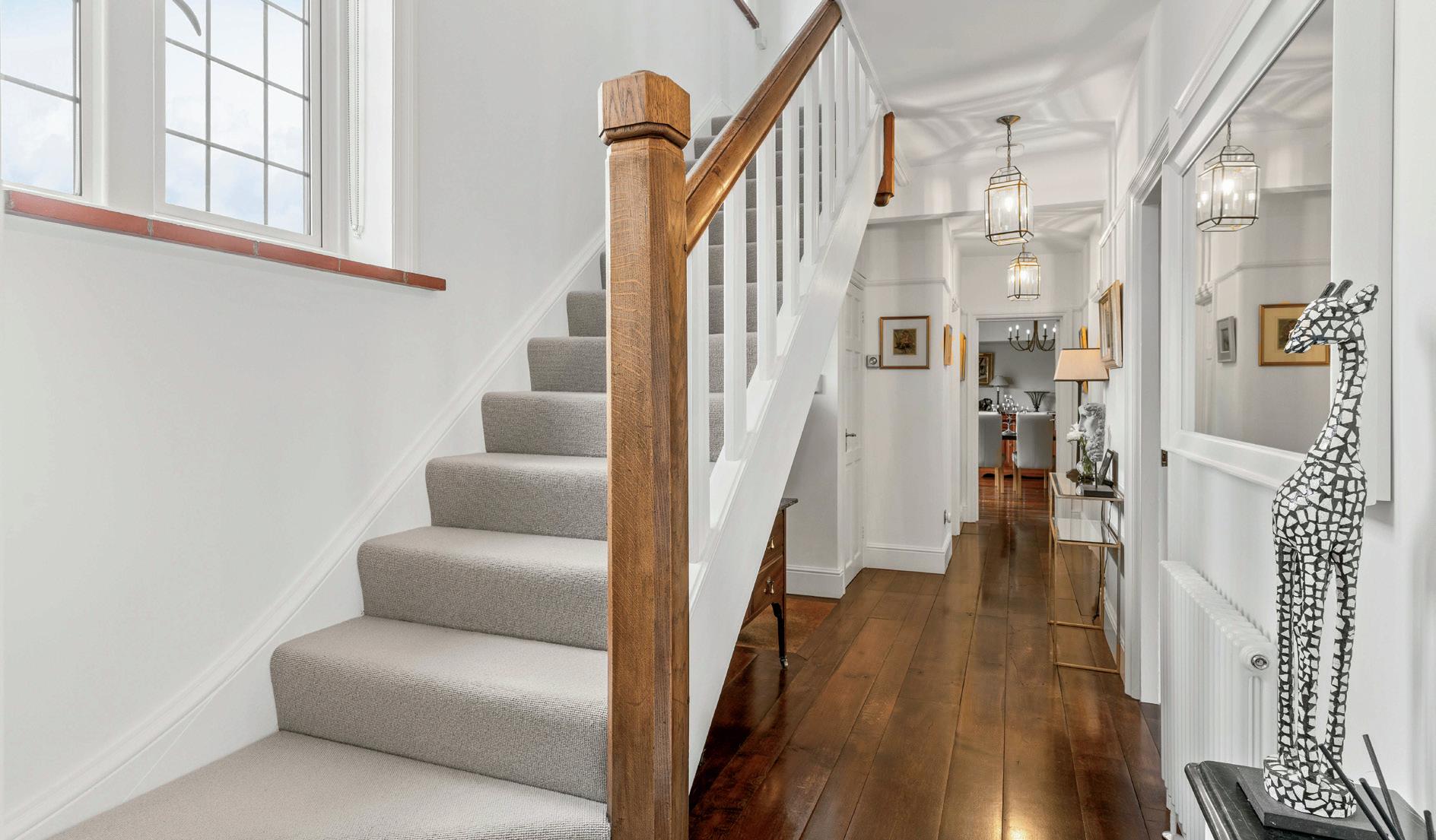 Step inside to a welcoming entrance Hall that sets the tone for the spacious and beautifully designed living and entertaining areas. The stunning triple aspect Drawing Room, complete with a brick feature fireplace, is flooded with natural light, while the solid oak flooring in the Hall, Study, Dining Room and Garden Room adds warmth and complements the home’s traditional styling. To the front of the property, a wellproportioned Dining Room offers an elegant space for formal entertaining and, via double doors, opens out into the Kitchen and dining area and Garden Room providing seamless views of the beautiful garden beyond. A versatile Study or additional reception room opens out to the charming Loggia where you can sit and admire the view of the garden at any time of the day and is ideal for seamless indoor-outdoor living. At the heart of the home lies the open plan Kitchen, breakfast and living area, thoughtfully extended by a light filled Garden Room. The bespoke Kitchen features a large curved central island unit with breakfast bar seating, a four oven AGA and an additional electric oven and built in wine fridge - all set within custom cabinetry. The Garden Room, with its beautiful wood floor and glazed panels, offers a peaceful spot to relax, while enjoying uninterrupted views of the garden. Off the Kitchen is a Utility Room/Boot Room with a door to the sideway where there are two exterior storage cupboards. From the Entrance Hall, a ground floor Cloakroom/WC is conveniently located and a staircase leads to a galleried Landing on the first floor. The impressive Principal Bedroom overlooks the gardens and is generous in size, featuring built in wardrobes and a matching large drawer unit. It is served by a large En-suite Bathroom with both a bathtub and a separate shower. A further Double Bedroom/Office also enjoys garden views and a stylish Main Bathroom serves this level. Across the Landing, a quiet area hosts two additional bedrooms - ideal for guests, older children or home offices. There is a pull-down ladder for easy access to the loft space, of which the middle section has been fully insulated, plastered and carpeted to make an Attic Room.