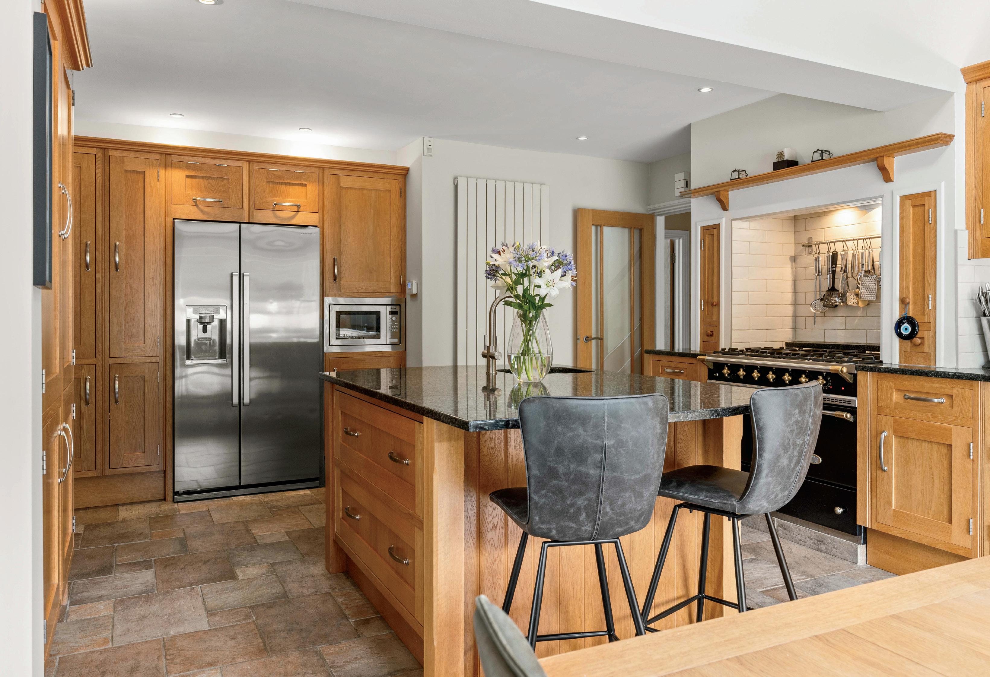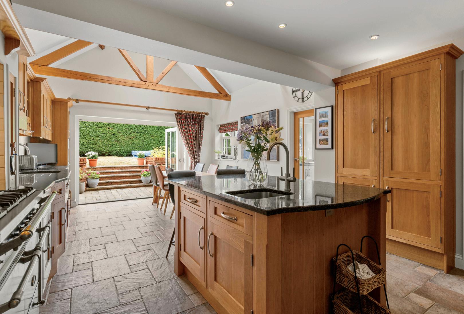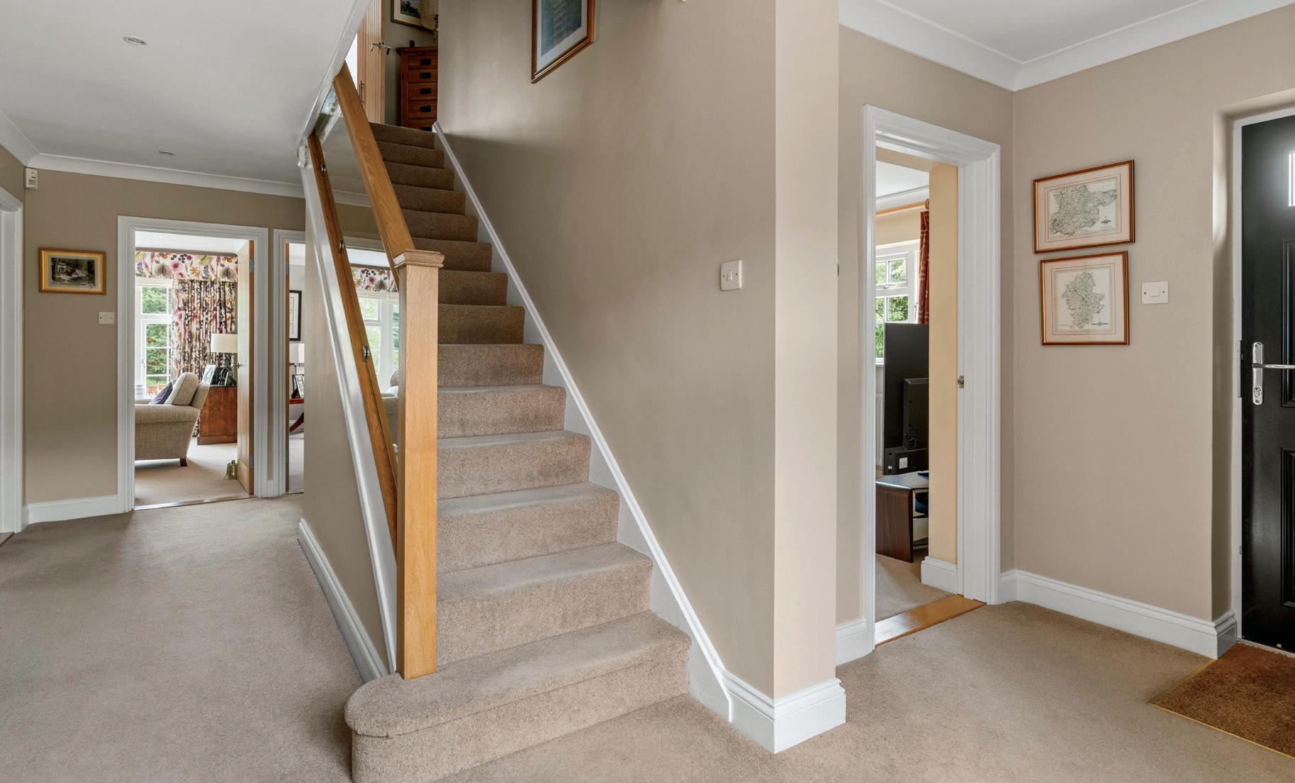 Inside, the property is finished to an exceptional standard, featuring elegant interiors and generously proportioned living areas. The ground floor includes four distinct reception rooms, a dedicated study and a music room, providing versatile spaces for family life and entertaining. Traditional touches include feature fireplace and original built-in cabinetry, together with oak double doors connecting the reception areas. The bespoke oak kitchen/breakfast room, with its stunning vaulted ceiling, is both stylish and functional incorporating built-in appliances and ample space for breakfast dining, with an adjoining utility/boot room and a convenient cloakroom/WC off the welcoming hallway.