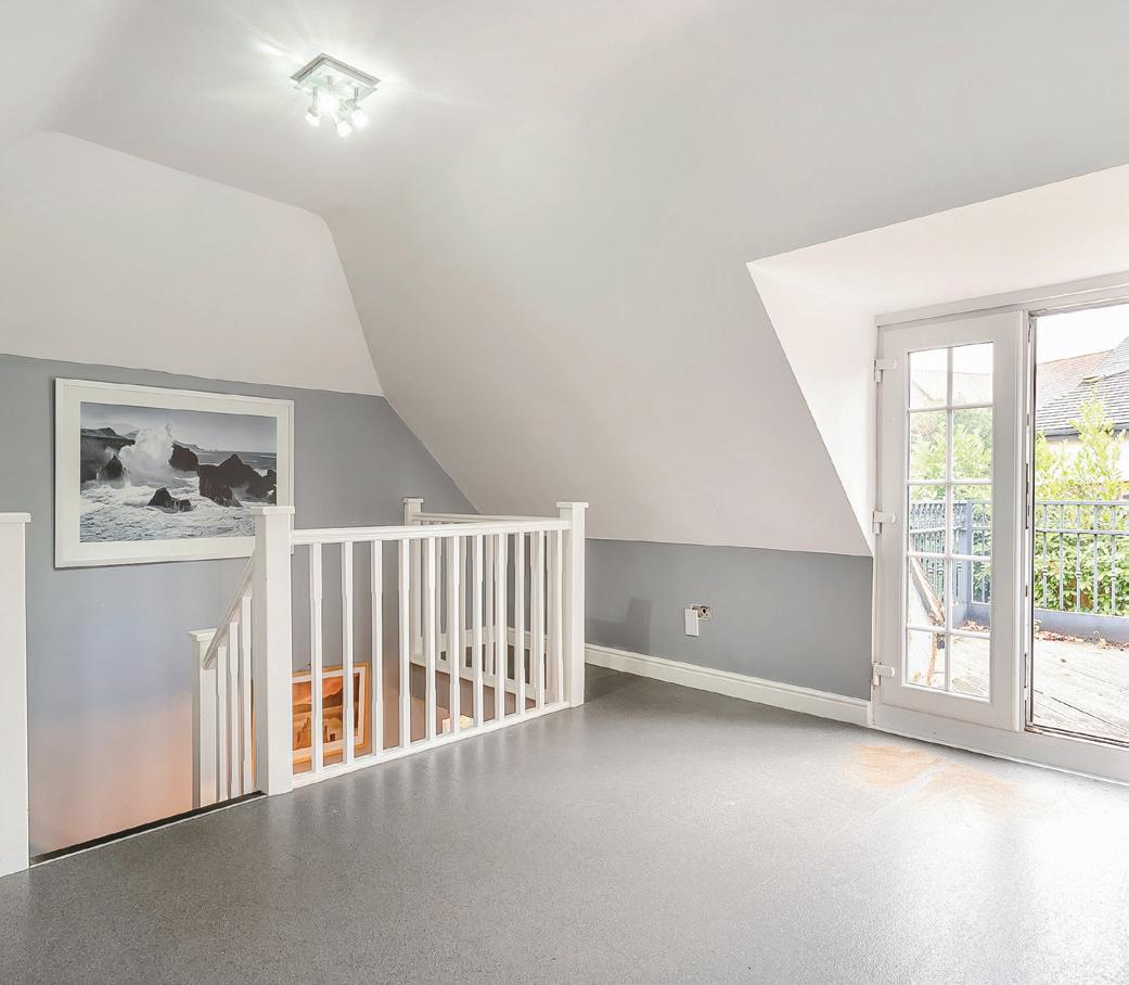A separate double garage and a private, self-contained annexe provide flexible additional accommodation, perfect for multi-generational living, guest quarters, or potential rental income. The annexe incorporates its own kitchen, downstairs bathroom, and an expansive first-floor living/bedroom area with double French doors opening onto a private balcony, offering complete independence and privacy.