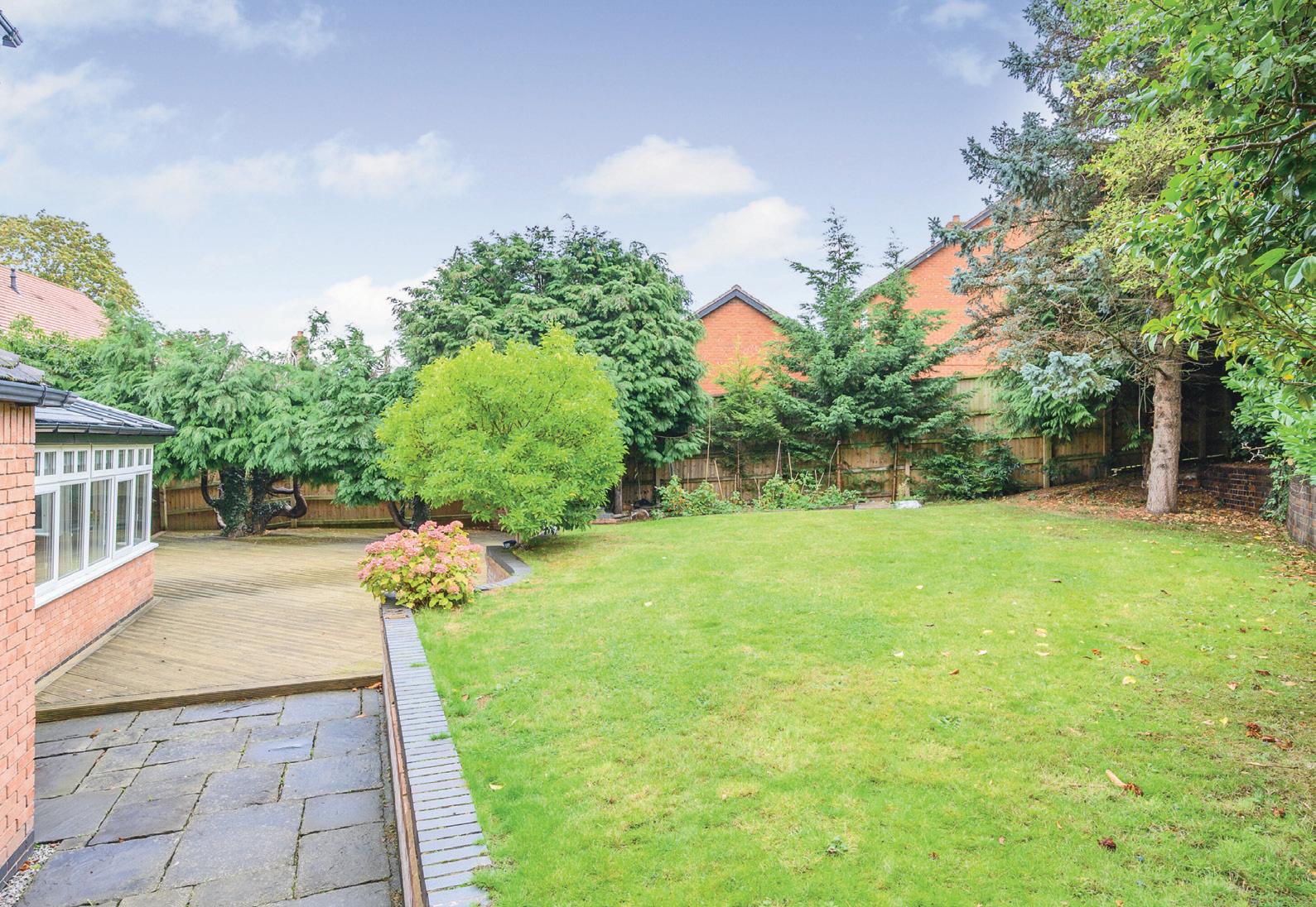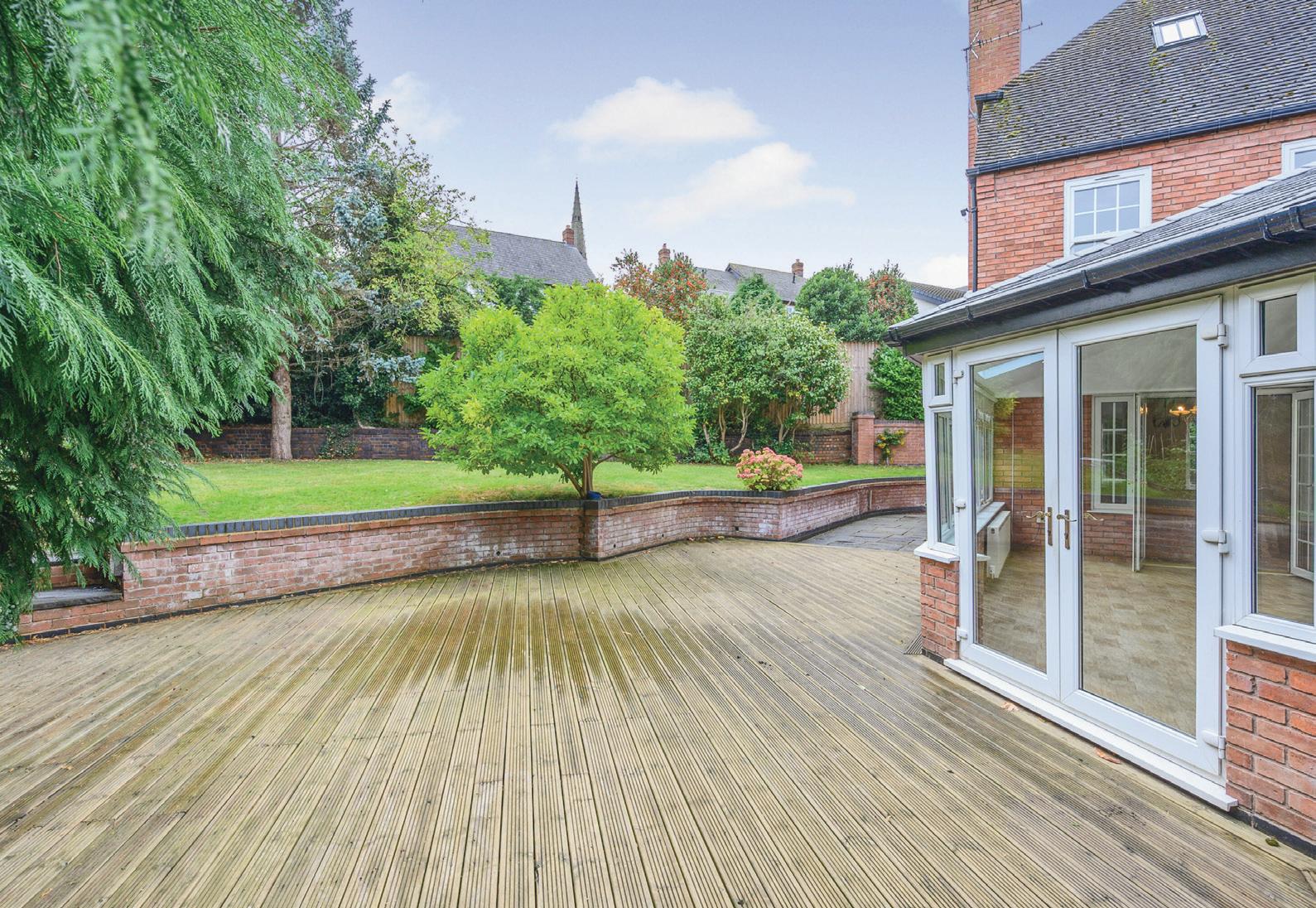 To the rear, multiple sets of double doors open onto elegantly decked, south-facing terraces, creating the ideal setting for al fresco dining and entertaining. Beyond the main terrace lies a secluded garden area, offering additional space for children’s play equipment, outdoor storage, or further planting. A wide side pathway provides easy access around the property, linking the main house with the annexe and garage for added practicality and flow.