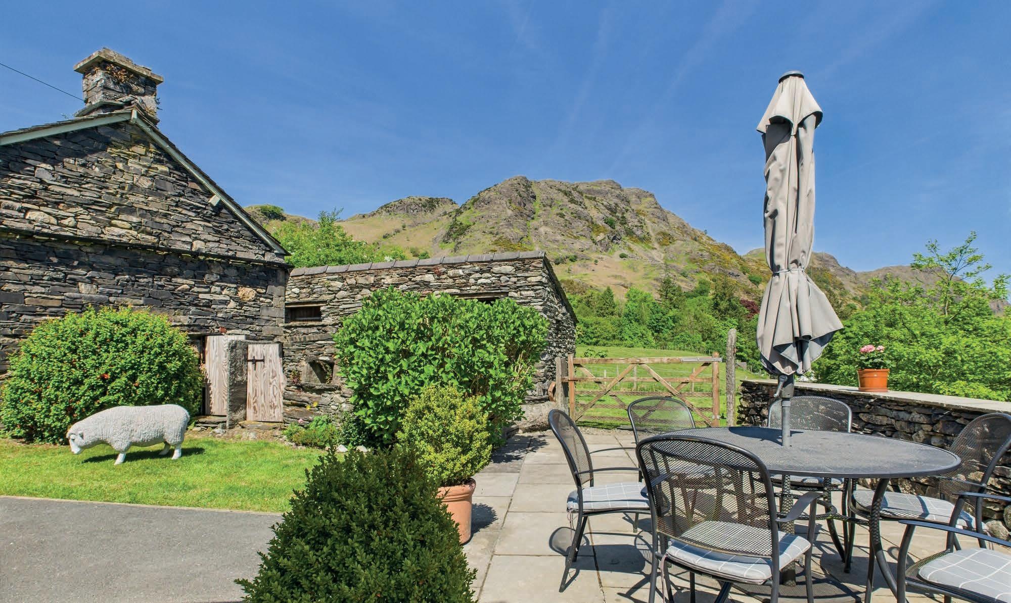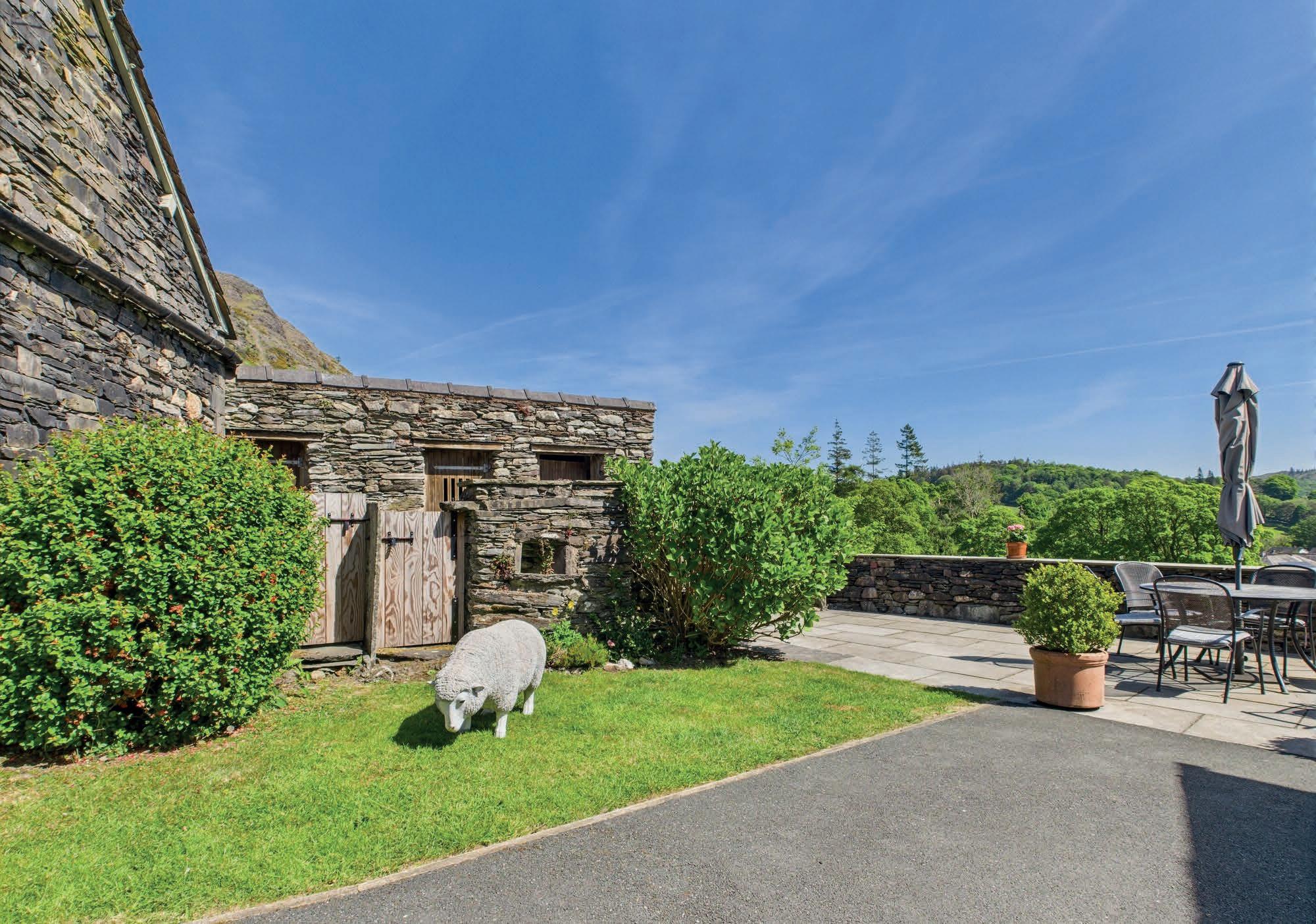 Cottage style gardens lay to the south of the farmhouse with well established colourful planting including azaleas, acers, camellias, peonies, roses and foxgloves. Paths of slate chippings run under the front windows and offer opportunity for bench seating. The path leads round to the side and then into rear farmyard. This is the main seating area, a sunny terrace with great views over the village to the fells beyond. Many comments left in the visitors’ book refer to the views, it’s easy to see why, they are incredibly restful. The hustle and bustle of the village below you seems a world away. The immediate garden is all walled, fenced or gated to be secure for children and dogs. However, beyond this there is a further garden area, a mowed lawn for picnics and play, adjoining this a delightfully informal meadow punctuated with flowering shrubs. A lovely area for exploration, spotting wildlife, nature appreciation, making dens, treasure hunts and games of hide and seek.