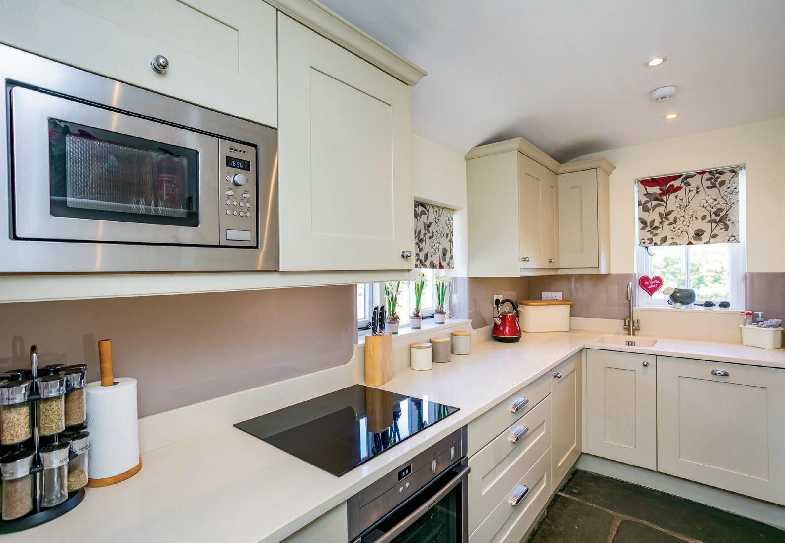 Exceptionally picturesque, the farmhouse has a striking cast iron decorative gabled porch adorned with scented honeysuckle and jasmine. The wide front door is unusual and opens into the sitting room which has a slate flagged floor. This continues into the staircase hall, dining room and kitchen. Between the sitting room and the snug is a plank and muntin partition with fielded panels and a panel door connecting the two. Ramping up the cosiness of this charming property are the woodburning stoves, the sitting room has an intricately carved pine fireplace with an alcove cupboard cleverly concealing the TV’s modern technology. The snug has a more rustic fire surround that’s no less characterful. The dining room has a cheery red Rayburn for decorative purposes only, cooking and heating now being provided by more modern arrangements. Two of the first floor bedrooms have sweet decorative fireplaces adding to their charm.