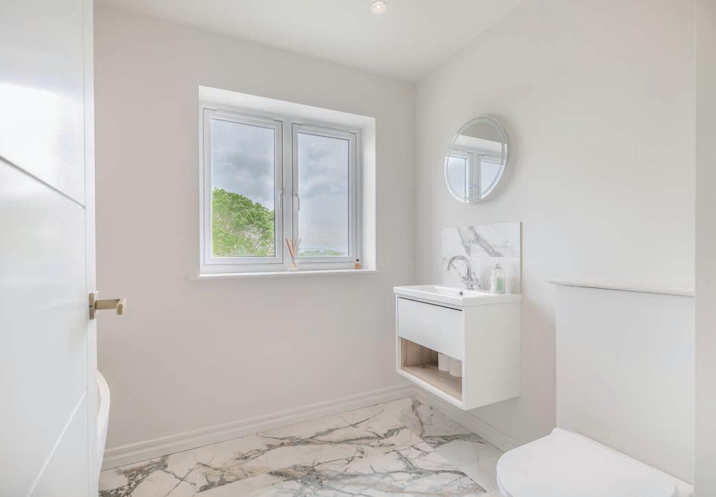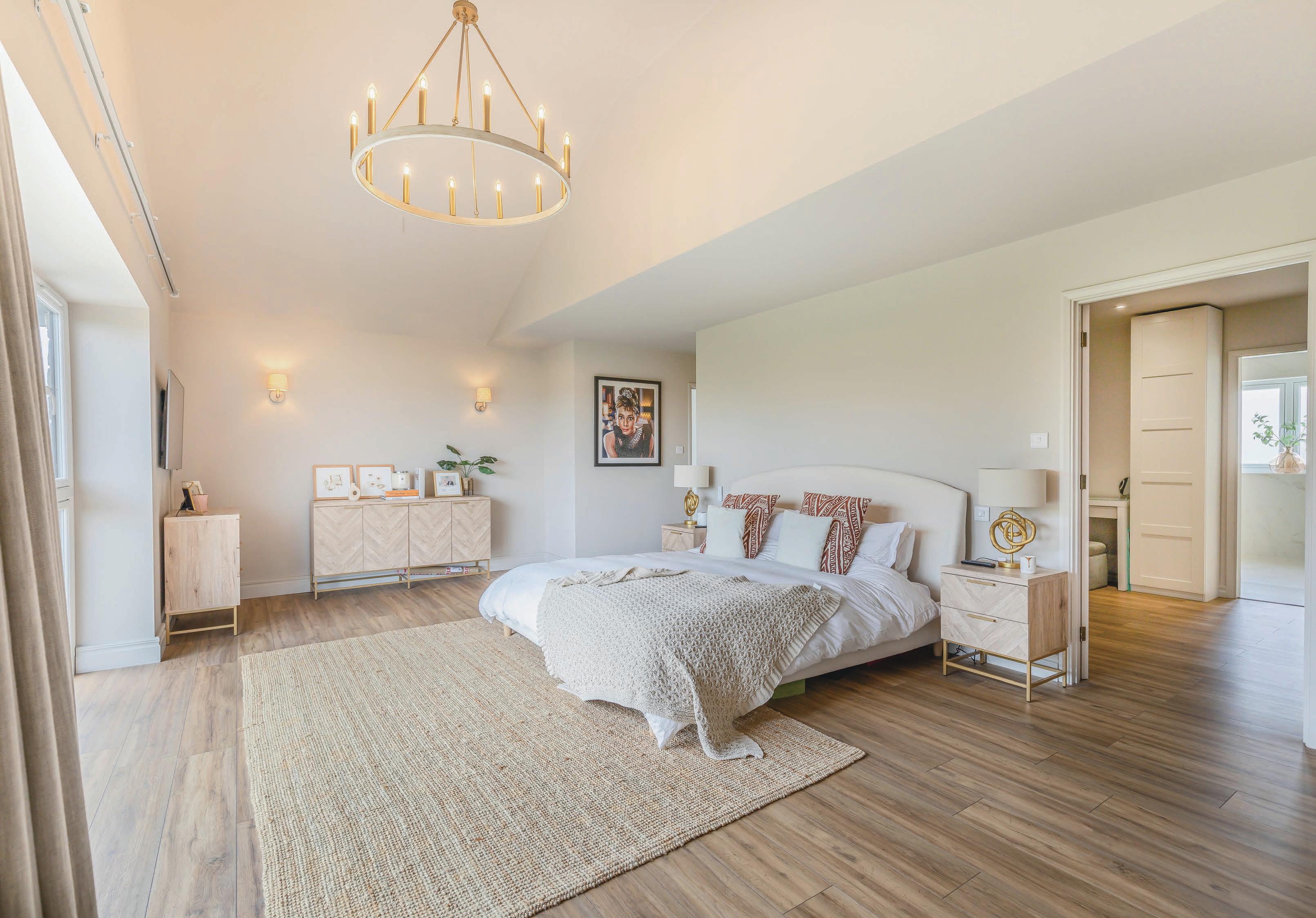 Upstairs, the hallway is bathed in natural light from both the front and back, offering a peaceful space to read a book and enjoy the views. The main bedroom suite is an epitome of luxury, with stunning countryside vistas, a large dressing room, and a beautiful shower room featuring dual Lusso Stone vanity sinks. The guest suite also enjoys far reaching views, a dressing area, and an en-suite shower room. Two additional double bedrooms share a stunning family bathroom with Firenze tiles and a Lusso Stone bath, completing the upper level.