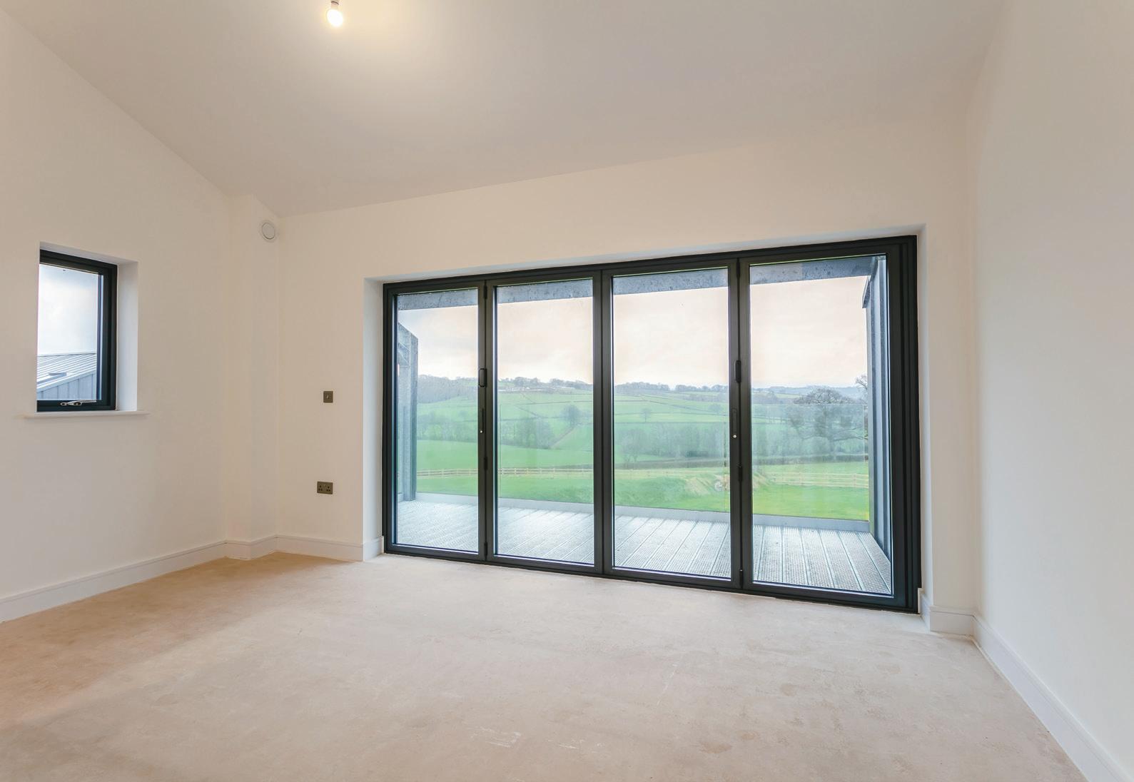 The expansive open-plan kitchen and dining area is a true highlight, featuring floorto-ceiling windows and bifold doors that seamlessly connect indoor and outdoor spaces, allowing you to fully immerse yourself in the stunning countryside.