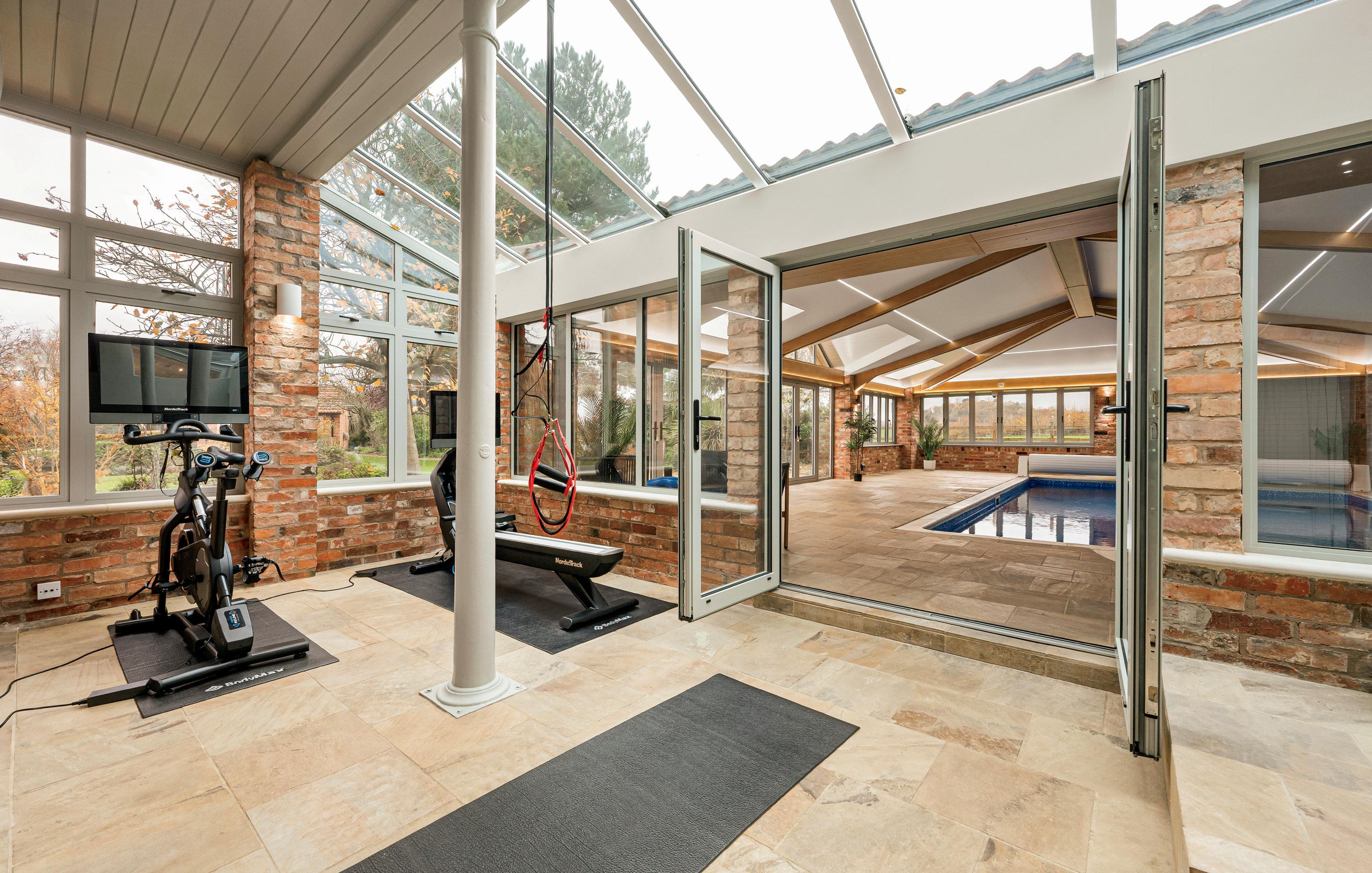 The indoor heated swimming pool, connects to the house via a spacious leisure, gym and relaxation area. Accompanied by a Nordic-style sauna, luxury changing facilities and a wet room, it creates a private retreat designed for enjoyment all year round.